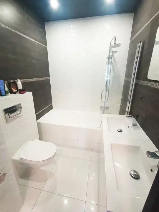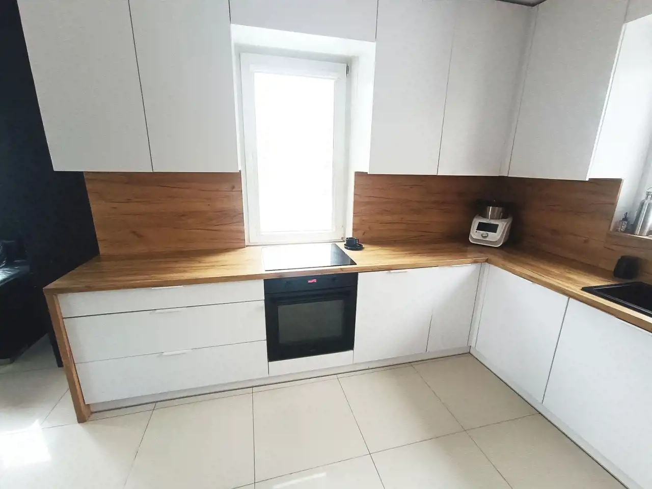 Kuchnia jest w pełni umeblowana i wyposażona w sprzęt AGD, gotowa do codziennego użytkowania. Łazienki zostały funkcjonalnie zaprojektowane – jedna z wanną, druga z prysznicem – obie wykończone estetyczną glazurą.