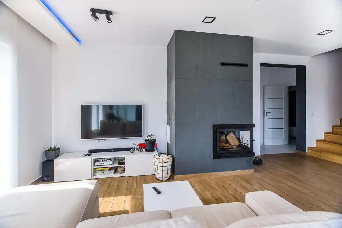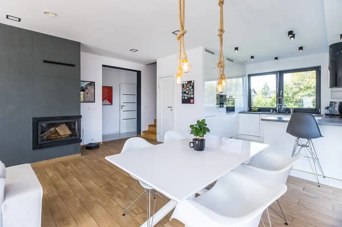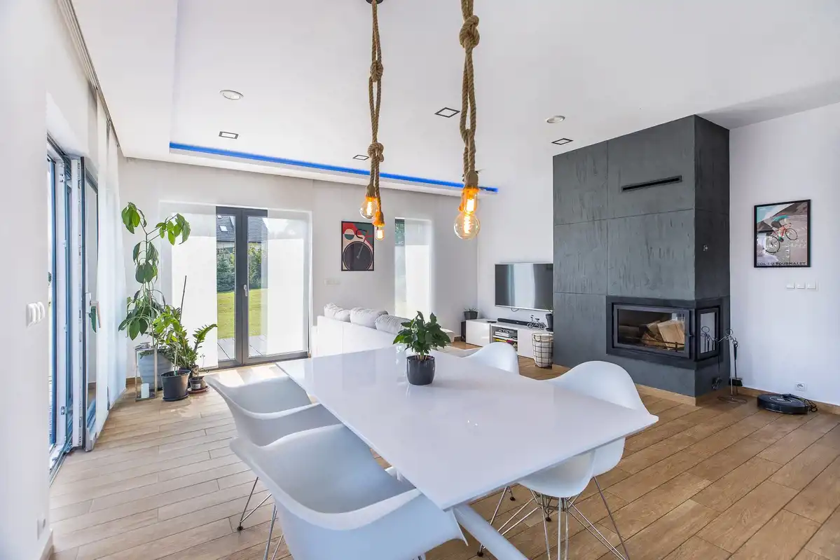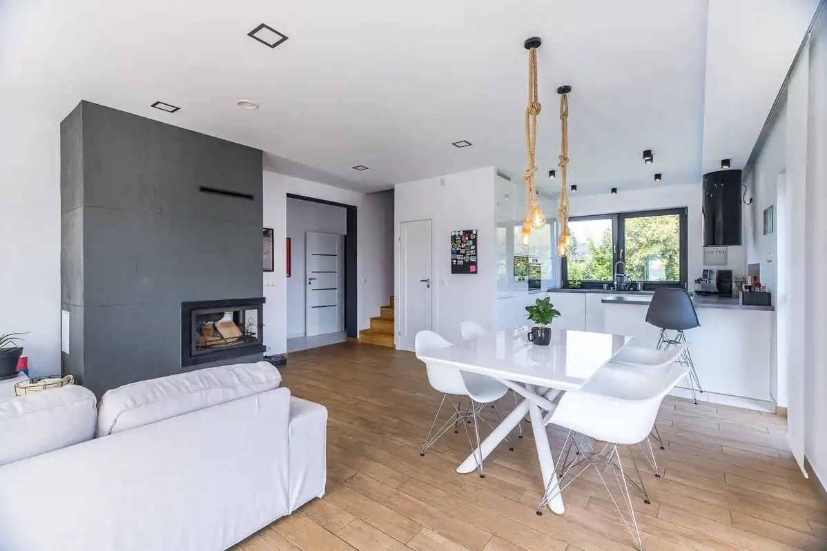 Dom energooszczędny - bardzo niskie koszty utrzymania i ogrzewania ze względu na połączony system składający się ze sprzężonych ze sobą urządzeń, tj. pieca gazowego, kominka oraz podgrzewanych podłóg.