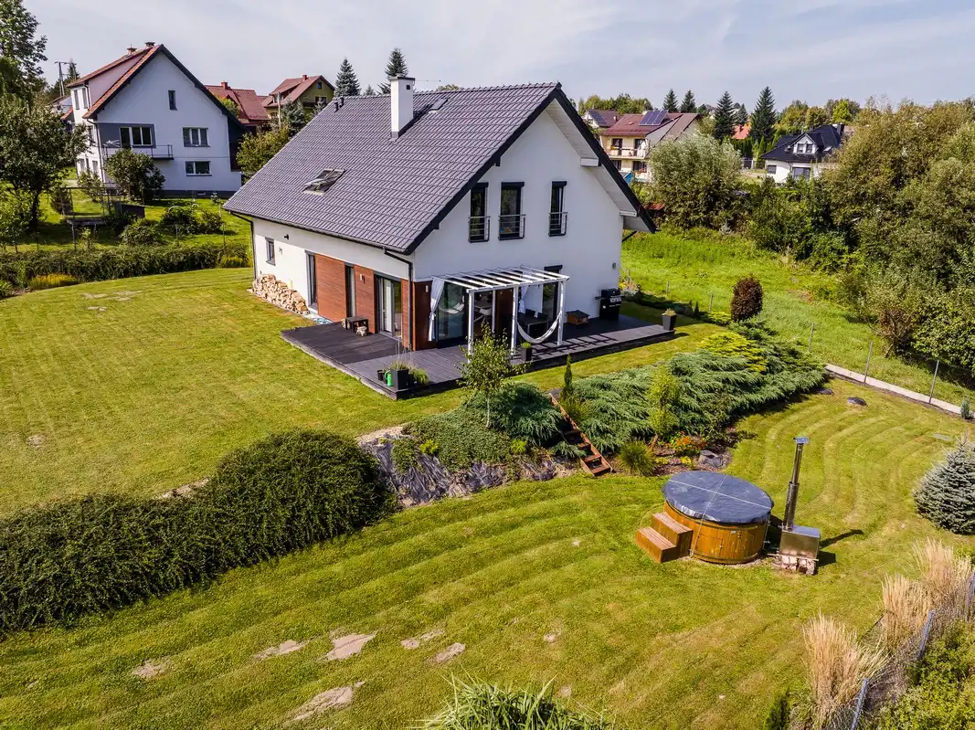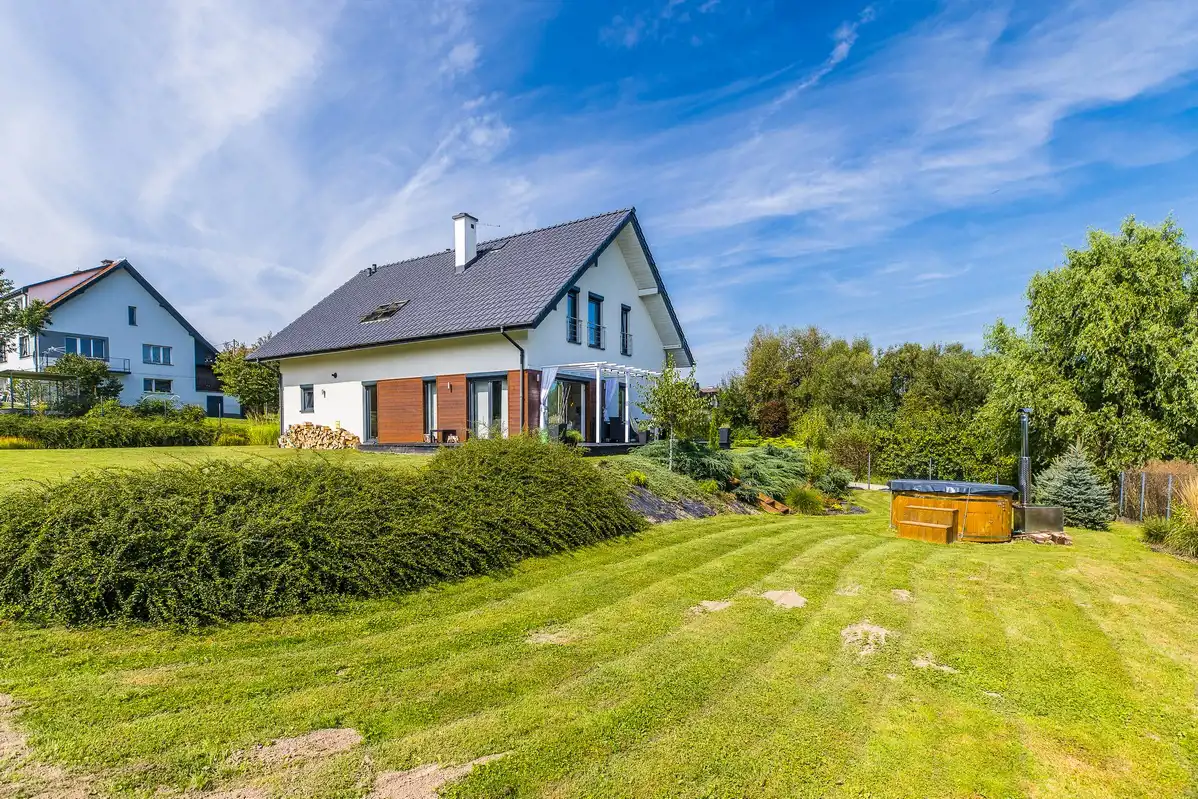 Na działce sporo kwitnących krzewów, kwiatów i roślin, a także jacuzzi (podgrzewanie wody ekonomicznym piecem).