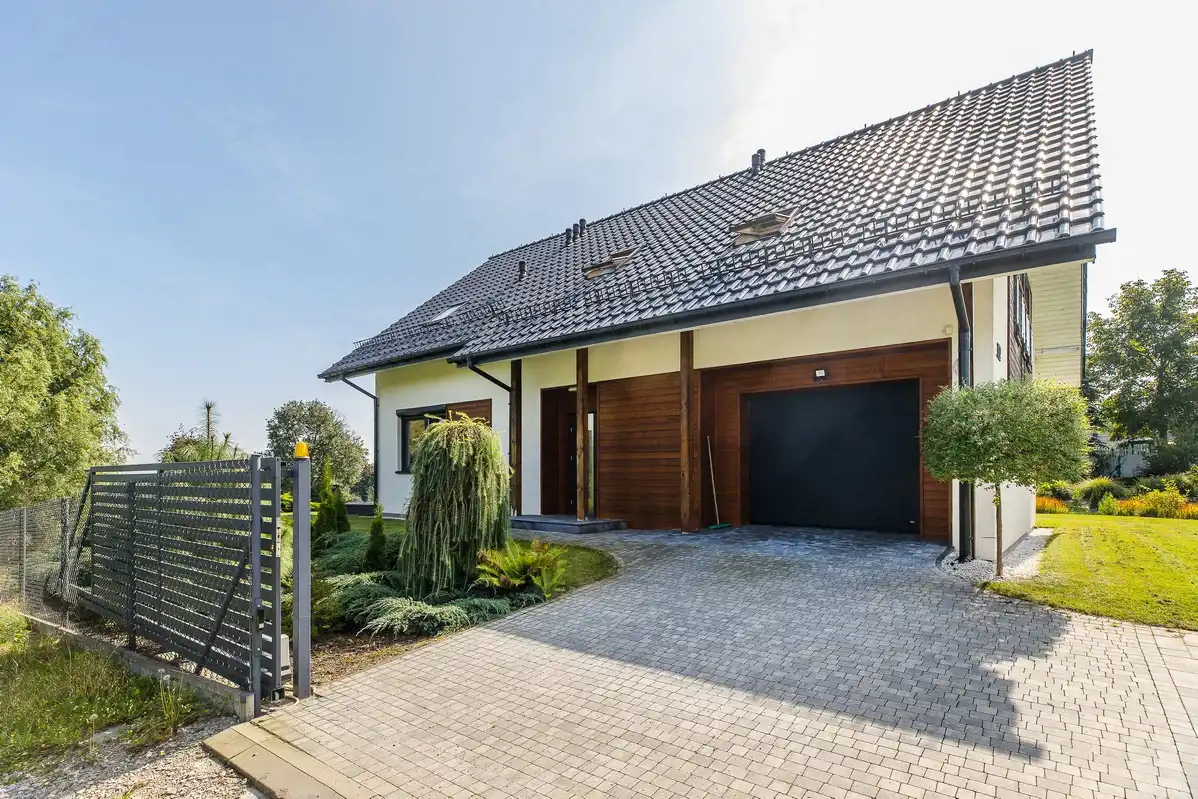 Dach kryty dachówką ceramiczną, okna nowoczesne PCV z żaluzjami sterowanymi automatycznie, ogrodzenie z bramą wjazdową na pilota i wybrukowanym podjazdem.