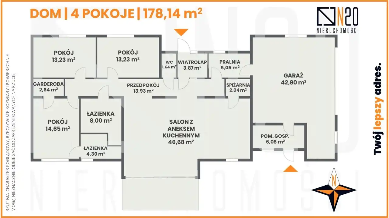N20 Nieruchomości oferuje do sprzedaży wolnostojący, parterowy dom w stanie deweloperskim o powierzchni całkowitej 178,14 m2 usytuowany na działce o powierzchni około 1200 m2.