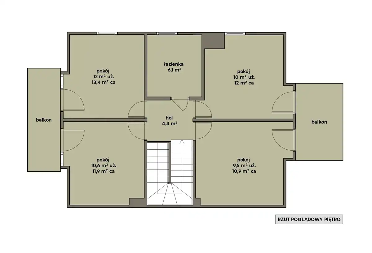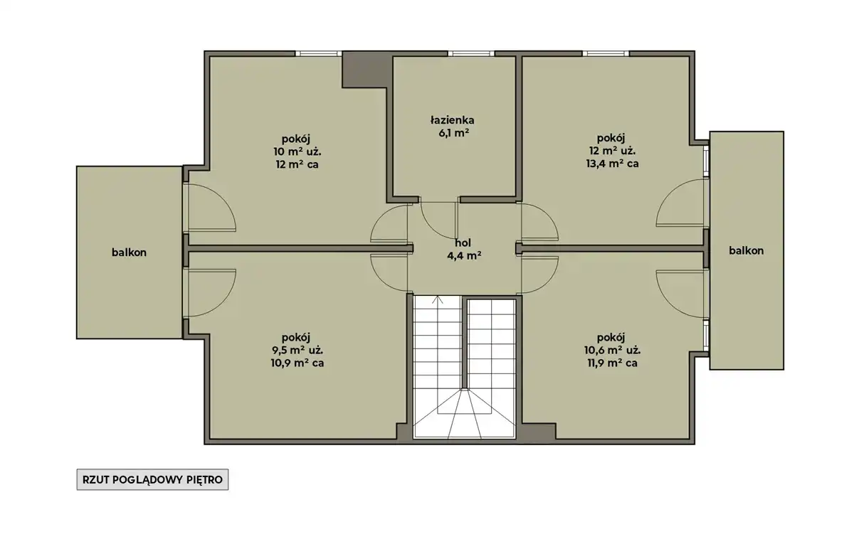 4 pokoje (powierzchnia użytkowa 12m2; 10,6m2; 10m2; 9,5m2. Powierzchnia całkowita 13,4m2; 11,9m2; 12m2; 10,9m2)