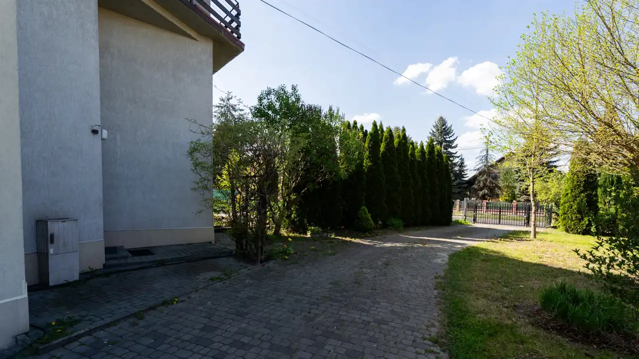 Brama wjazdowa otwierana pilotem, podjazd wybrukowany.