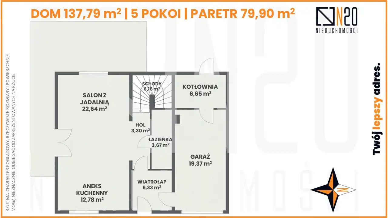 Na parterze znajduje się wiatrołap, przedpokój, łazienka, salon z aneksem kuchennym, kotłownia i garaż. Na piętrze znajdują się cztery sypialnie oraz łazienka (możliwość trzech sypialni oraz dużej garderoby).