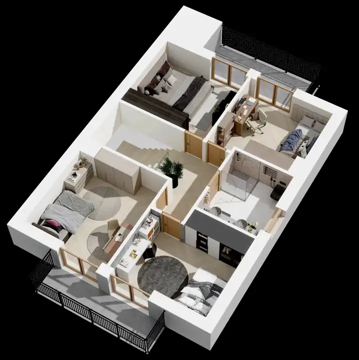 - Sypialnia 2 i sypialnia 3 – przestronne pokoje idealne dla dzieci lub jako gabinet.