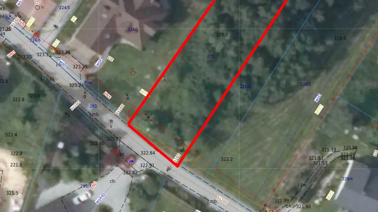 - Media Woda: w ulicy; Kanalizacja: na działce; Prąd: na działce; Gaz: na działce