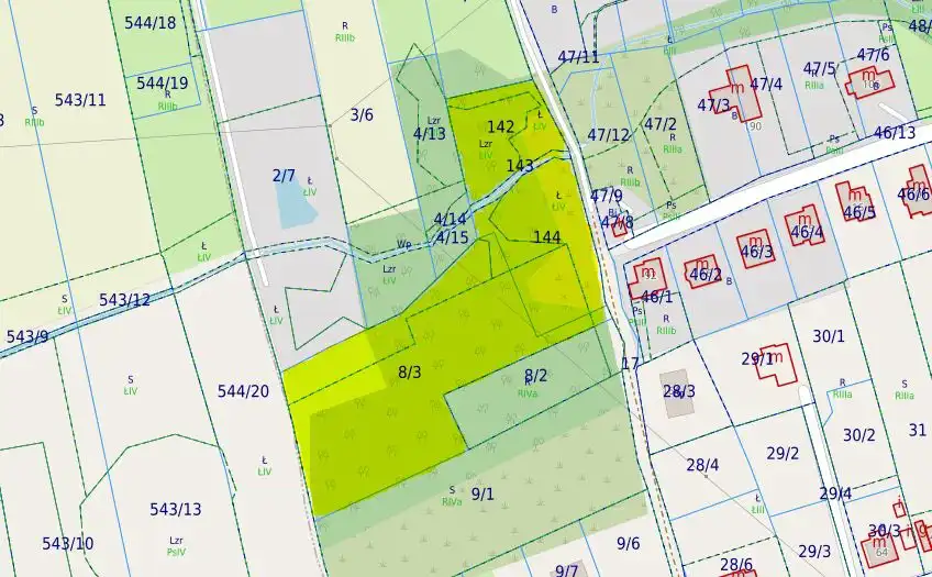 Budowlana i przylegająca do niej działka obejmująca łąki trwałe.