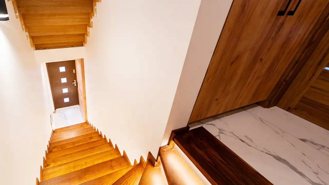 Poziom 1: salon z kuchnią, łazienka, 2 osobne sypialnie, garderoba, klatka schodowa, hool