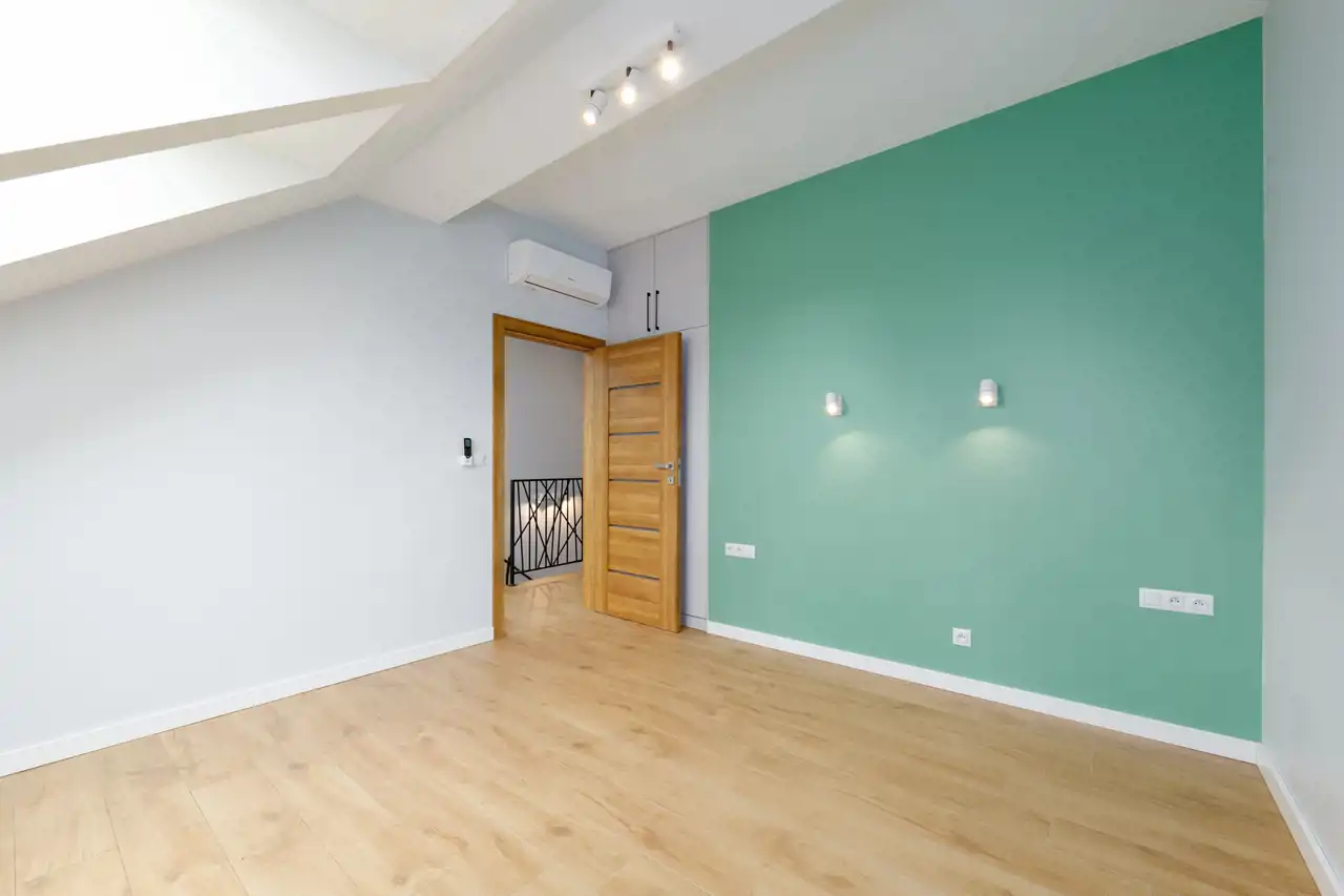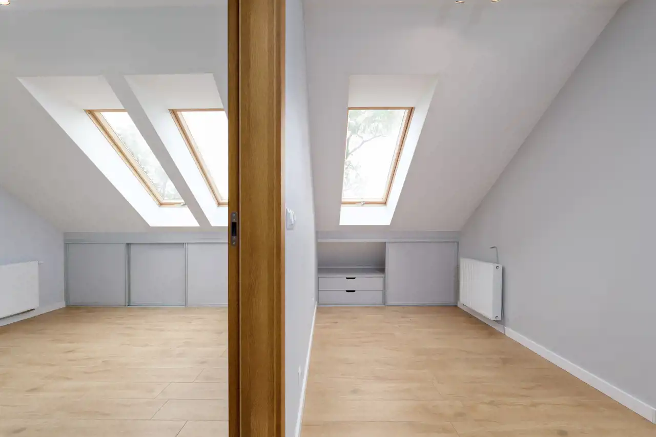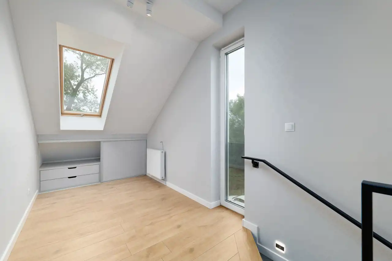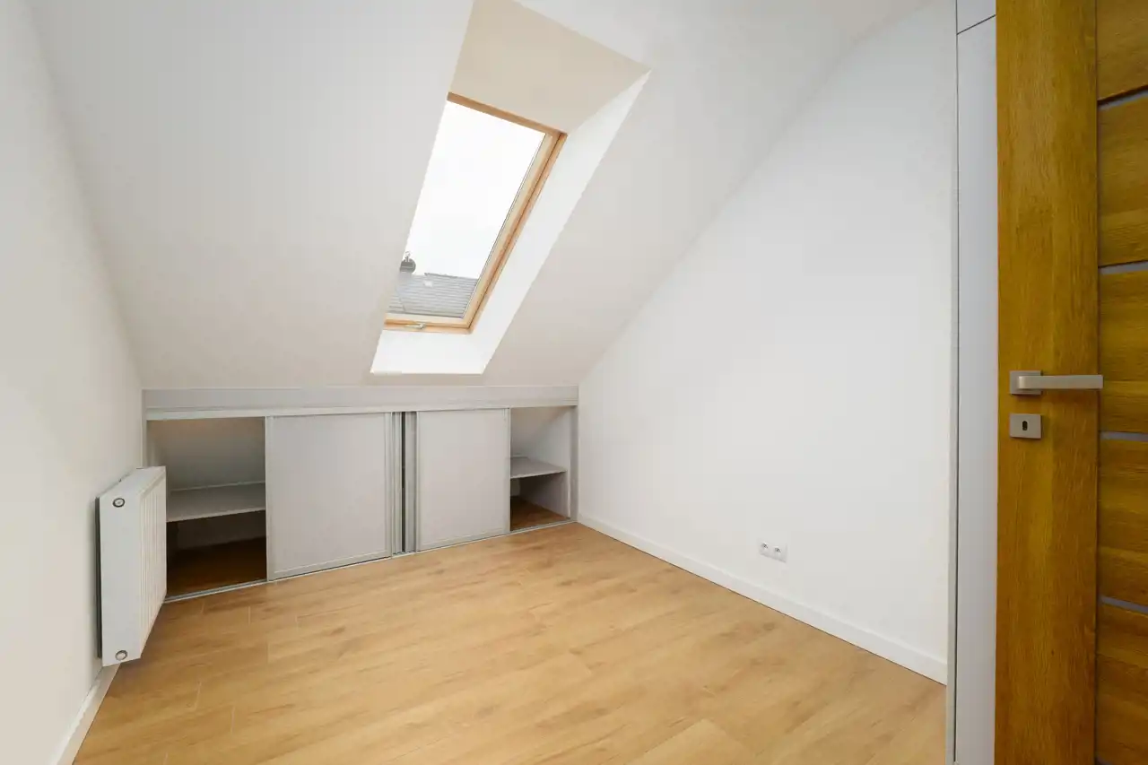 -skosy zostały w pełni zagospodarowane – eleganckie szafy w zabudowie, półki i schowki zapewniają maksymalne wykorzystanie przestrzeni.