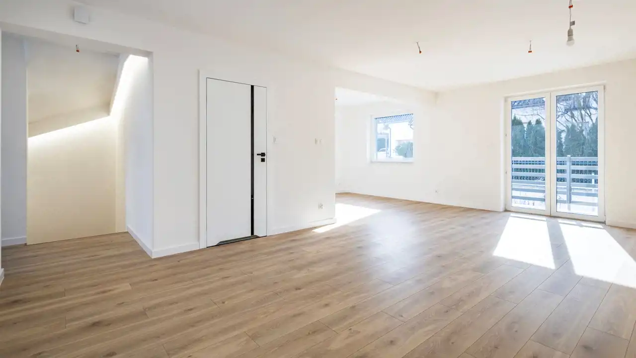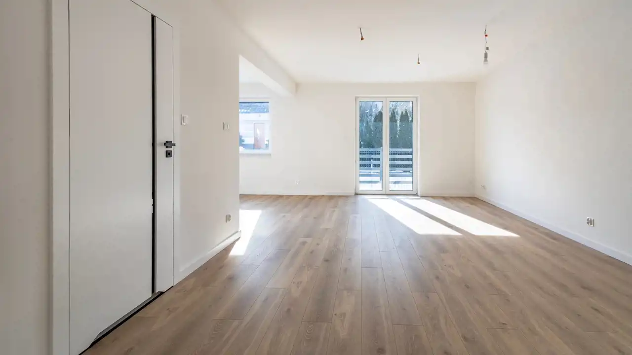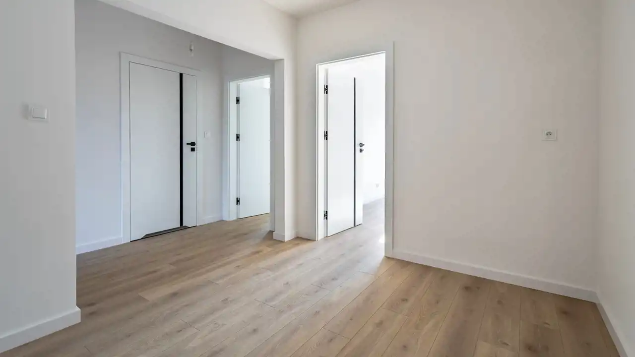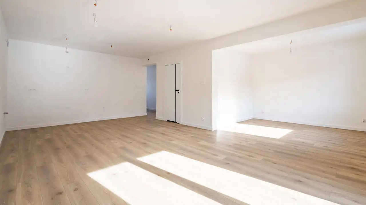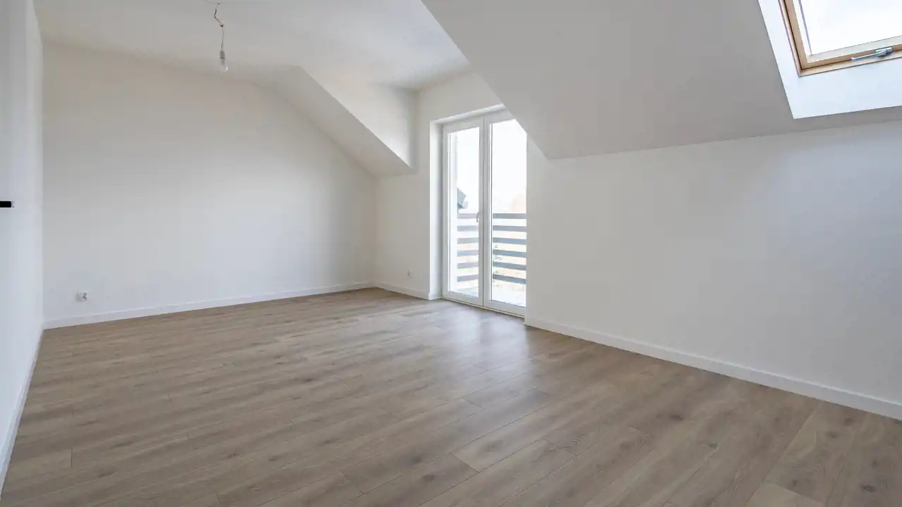 - montaż wysokiej klasy paneli podłogowych AC5 w eleganckim, ponadczasowym kolorze dębu, białe listwy cokołowe