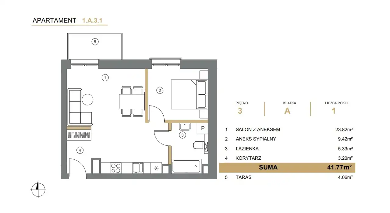 - Charakterystyka mieszkania 41.77 m2, 2 pokoje