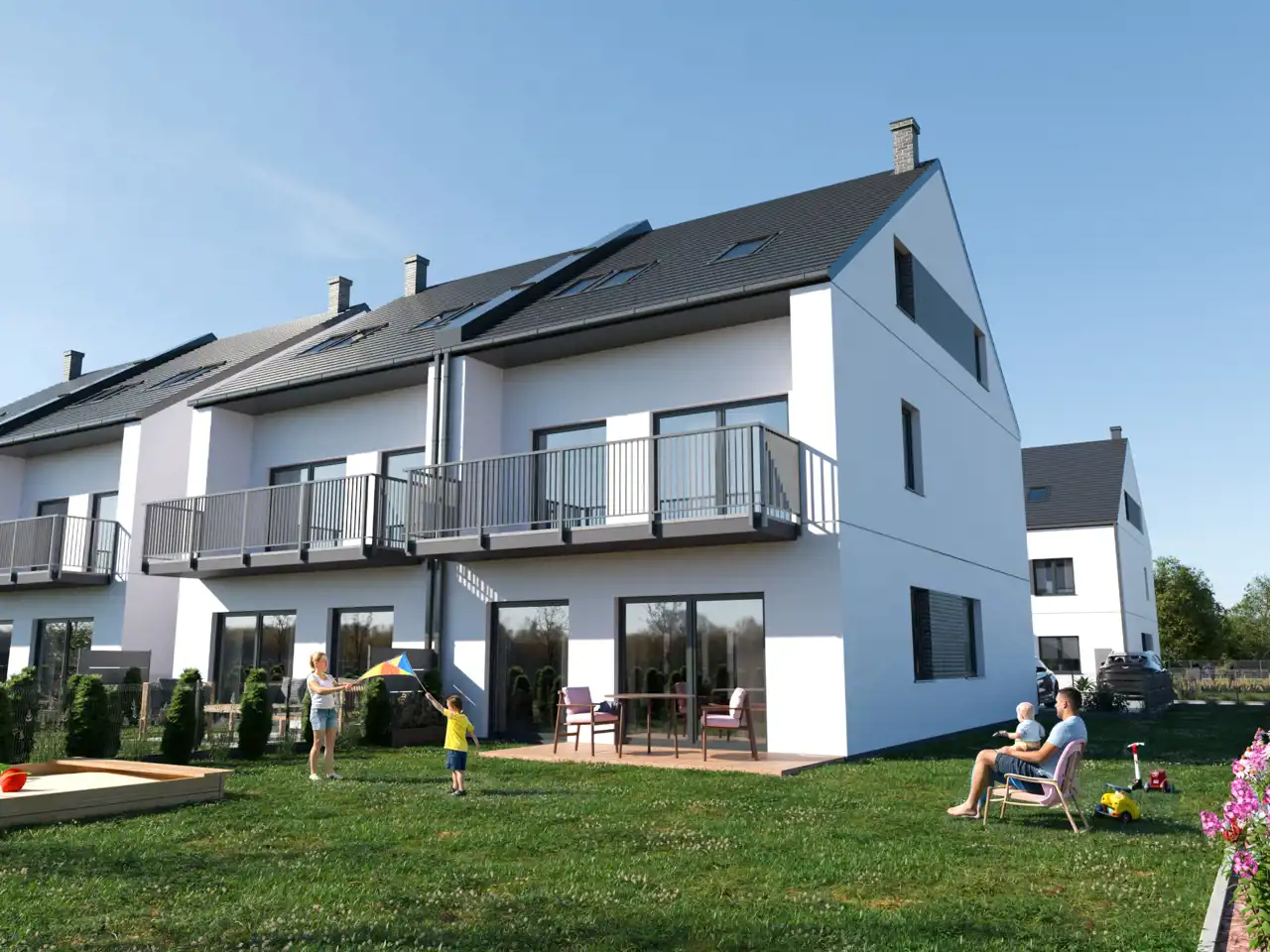 Starannie zaprojektowana przestrzeń łączy w sobie wygodę, prywatność i estetykę, tworząc otoczenie sprzyjające odpoczynkowi i budowaniu sąsiedzkich relacji.