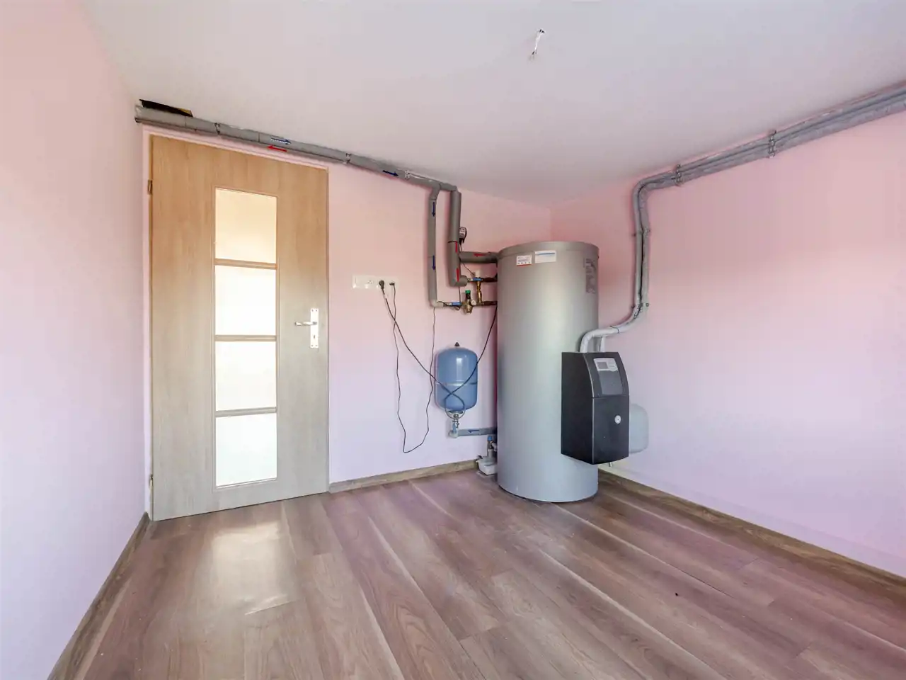W pomieszczeniu gospodarczym zamontowany zasobnik ciepłej wody użytkowej zasilany panelami słonecznymi.