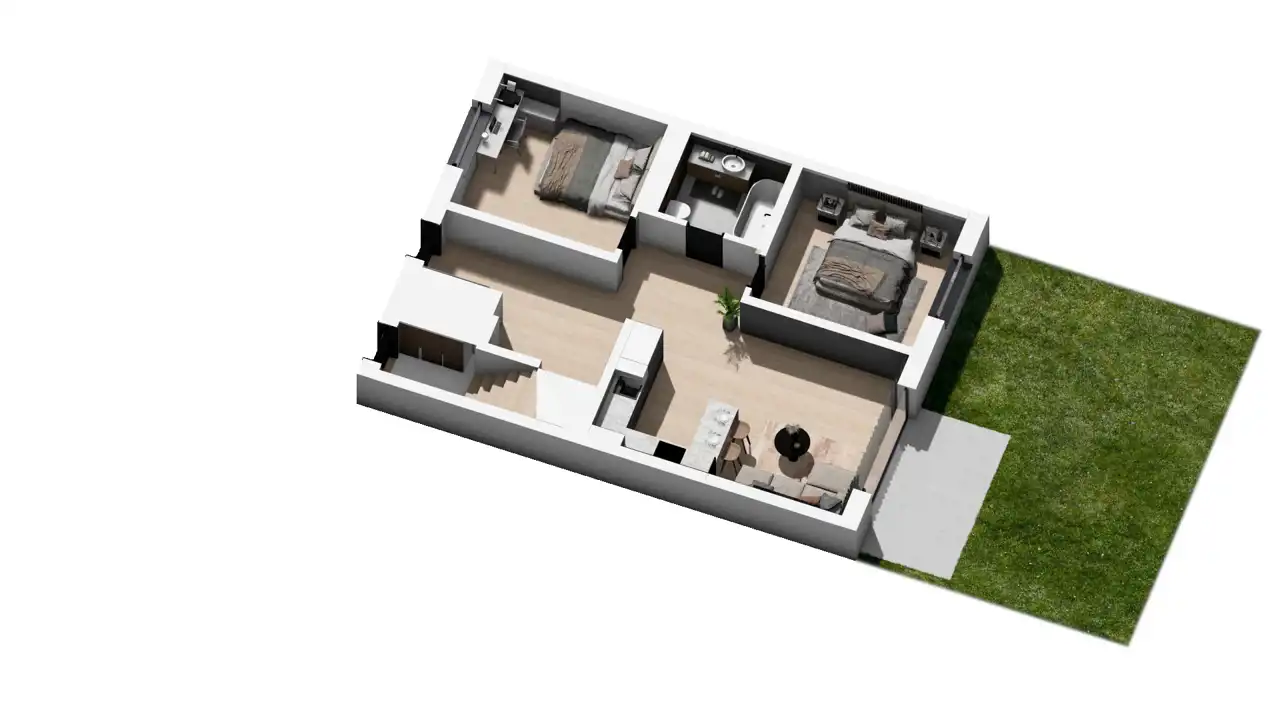 Powierzchnia mieszkania wynosi 64,17 m2. Wchodząc do mieszkania przechodzimy przez przedpokój, w którym zaprojektowano miejsce na szafę, garderobę lub dodatkowy schowek. Mieszkanie składa się z dużego salonu z aneksem kuchennym, dwóch sypialni oraz łazienki. Z salonu, od strony południowej, wychodzimy bezpośrednio do ogrodzonego ogrodu z wybrukowanym tarasem.