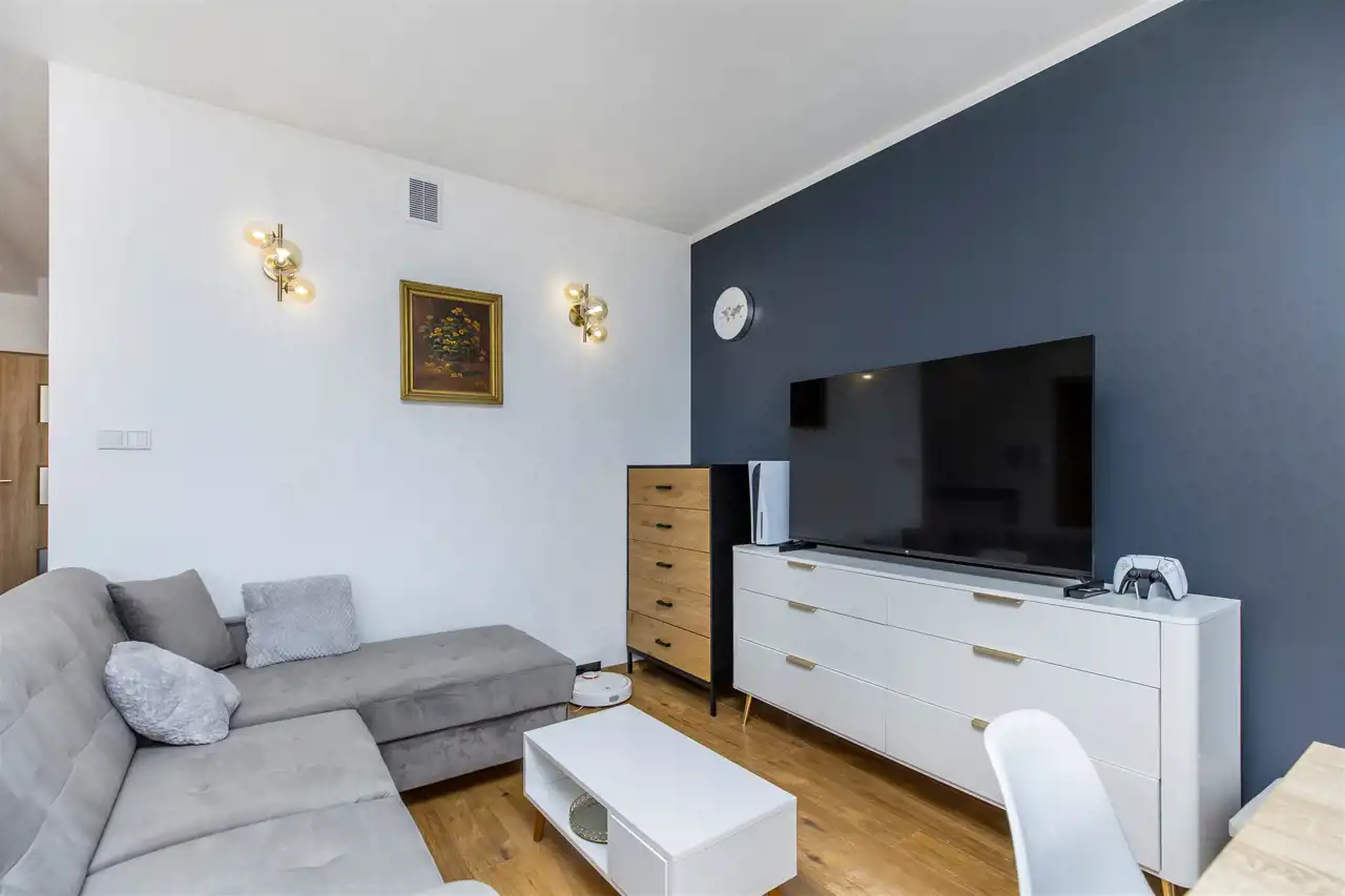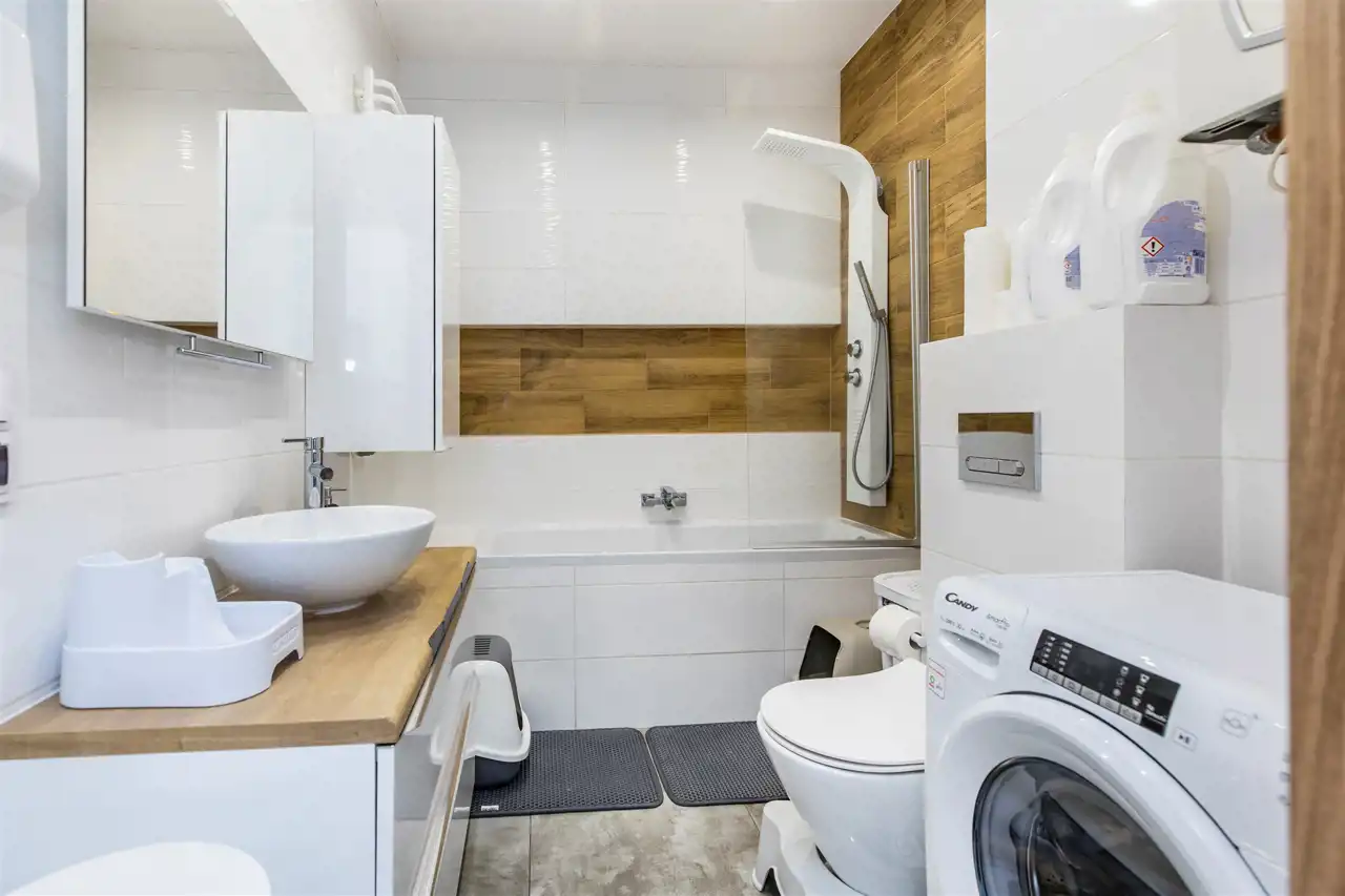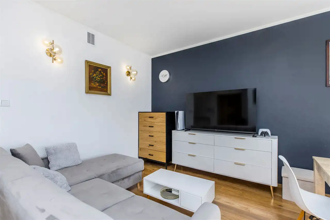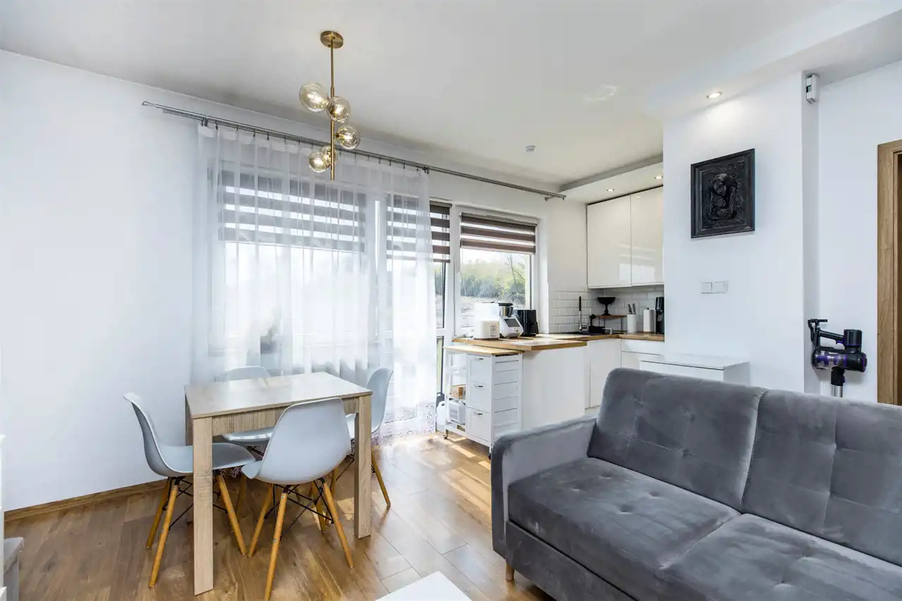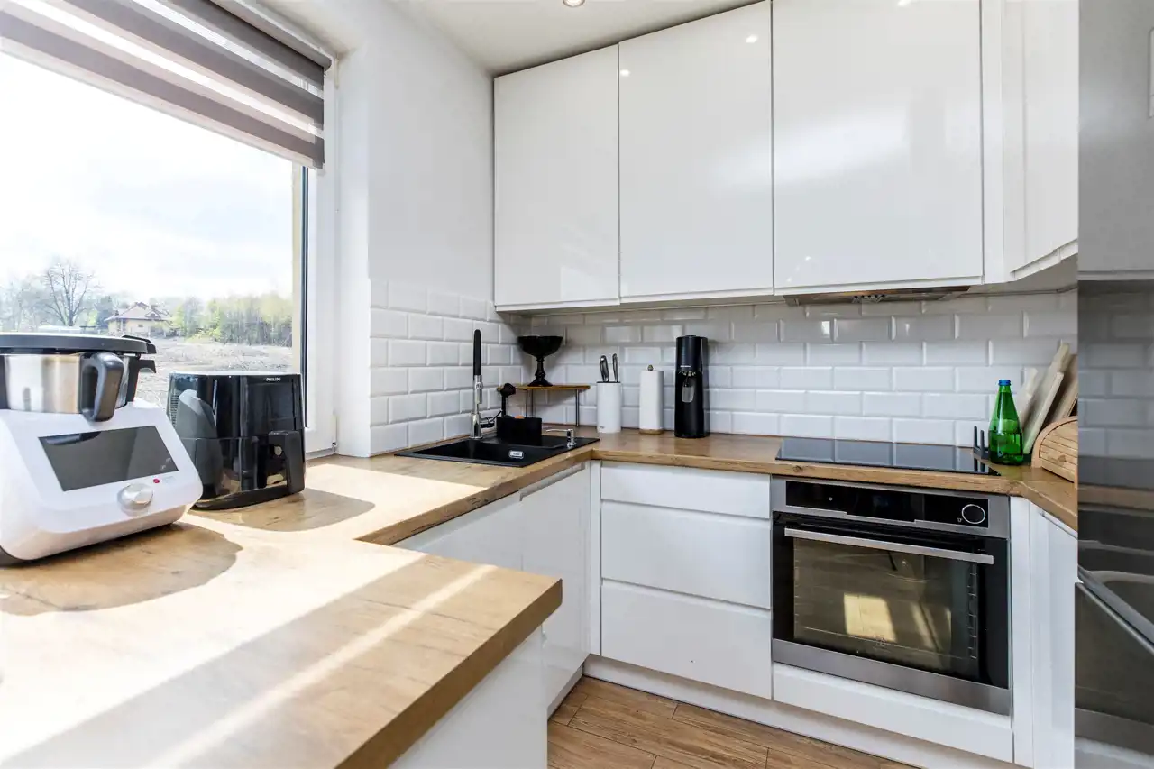 - kuchnia w zabudowie z pełnym AGD (piekarnik, płyta indukcyjna, zmywarka, lodówka, okap)