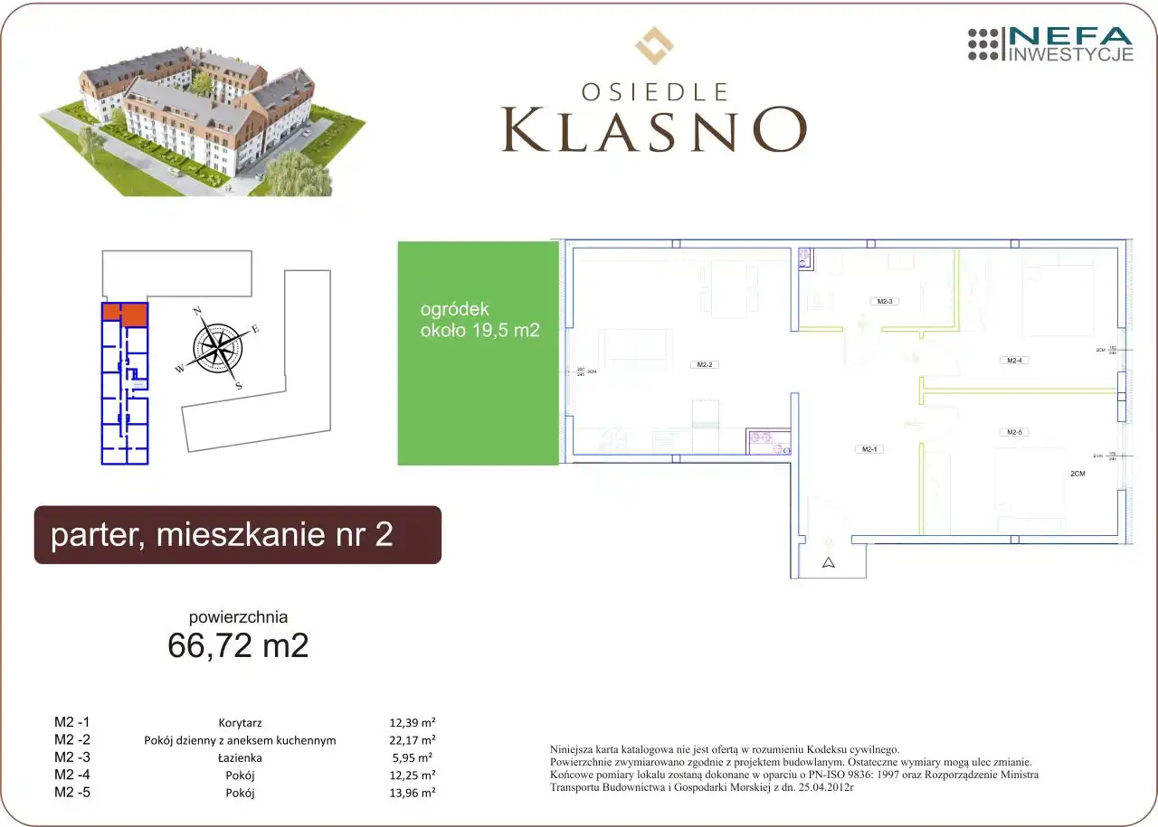 Trzypokojowe mieszkanie o powierzchni użytkowej 65,96 m2 położone na parterze w czteropiętrowym budynku znajdującym się przy ul. Jasnej w IV ostatnim etapie nowej inwestycji "osiedle Klasno" w Wieliczce. Do mieszkania przynależy ogródek o powierzchni ok. 20 m2.