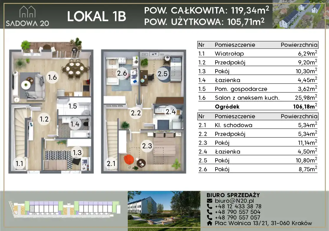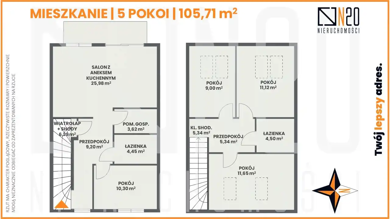 N20 Nieruchomości oferuje nowe mieszkania w stanie deweloperskim. Na inwestycji znajdują się dwupoziomowe mieszkania na piętrze o powierzchni 105,71m2 i jednopoziomowe na parterze o powierzchni 54,91m2 do których przynależą ogródki.