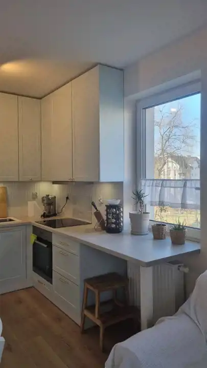 W kuchni meble w zabudowie wraz ze zmywarką, piekarnikiem, płytą indukcyjną, kuchenką mikrofalową, lodówką i okapem. Niebywałym atutem co jest rzadkością w nowym budownictwie jest łazienka z oknem, w której ponadto znajduje się wanną z funkcją kabiny prysznicowej. W przedpokoju bardzo duża i pojemna szafa.