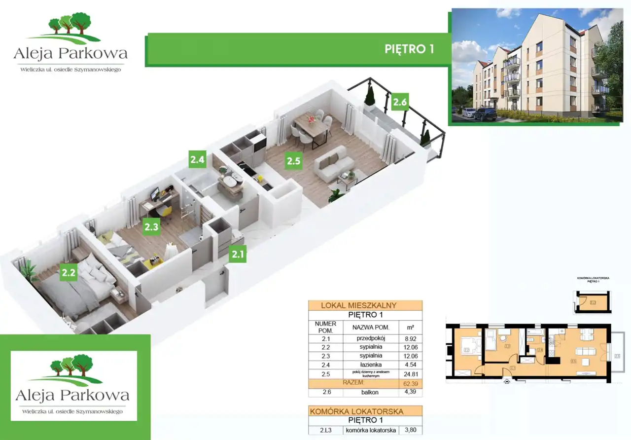 Do mieszkania przynależy komórka lokatorska 3,84m2 oraz miejsce postojowe w garażu podziemnym.