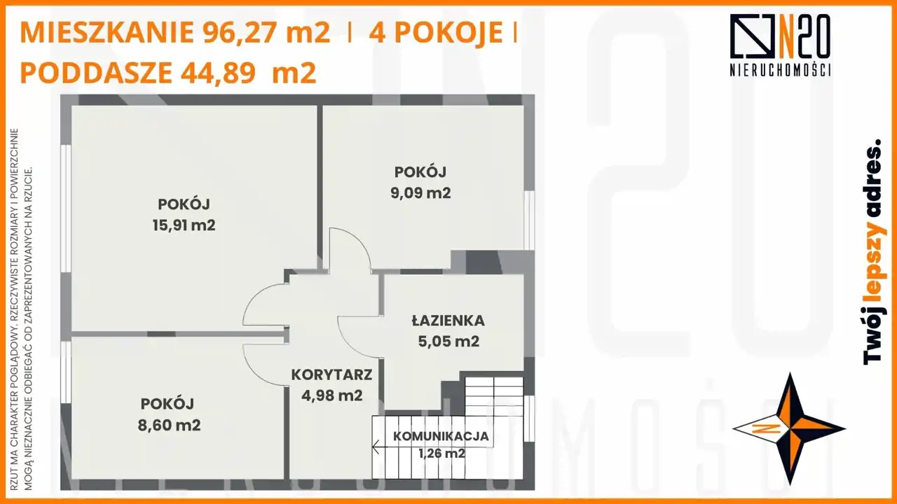 Lokal na piętrze to przestronne mieszkanie o łącznej powierzchni użytkowej 96,27 m², rozłożone na dwóch poziomach z balkonem. Na pierwszym poziomie znajduje się wiatrołap, salon z jadalnią wraz z kuchnią, łazienka oraz komunikacja prowadząca na poddasze, które stanowi pełnowartościową strefę z holem, komunikacją, łazienką oraz trzema niezależnymi pokojami o powierzchniach 15,91 m², 9,09 m² i 8,60 m². Taki układ doskonale sprawdzi się zarówno dla rodziny, jak i osób pracujących zdalnie, oferując wyraźny podział na strefę dzienną i prywatną.