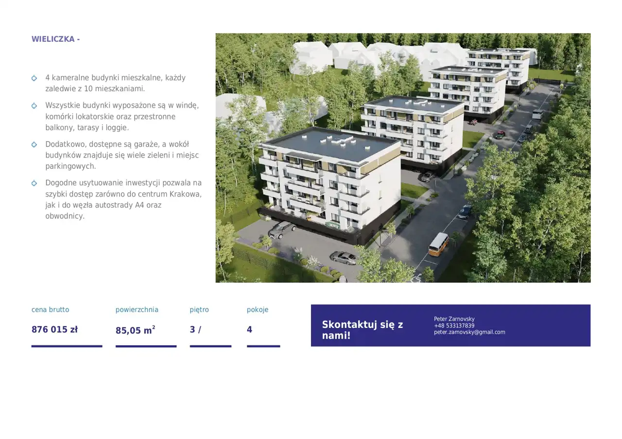 Wieliczka łączy spokojny, zielony charakter z bardzo dobrym dojazdem do Krakowa oraz szybkim wyjazdem na A4 i obwodnicę. To praktyczny adres dla osób mobilnych: blisko natury, a jednocześnie z wygodną komunikacją i zapleczem usług.