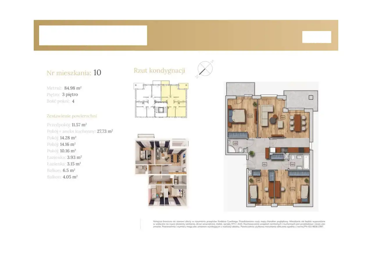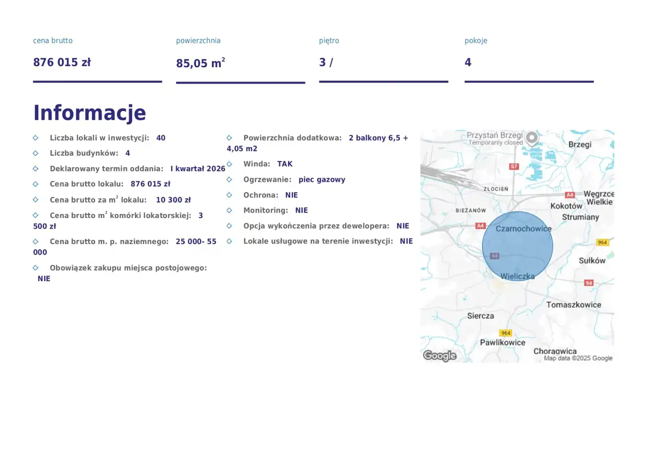 - Mieszkanie: 85,05 m², 4 pokoje, piętro 3.