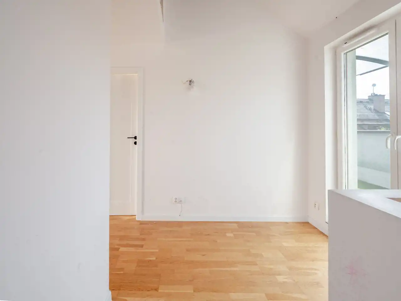 Dwa pokoje z wyjściem na balkon/taras, przestrzeń wspólna, łazienka z wanną i podwójną umywalką. Podłogi: naturalny dąb.
