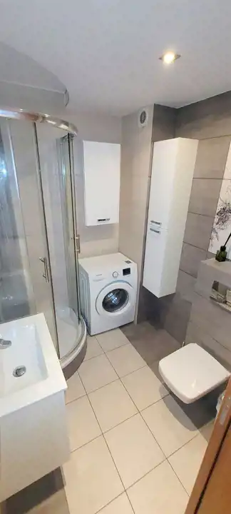 Łazienka z kabiną prysznicową, toaletą podtynkową, pralką i umywalką, również wykończona glazurą.