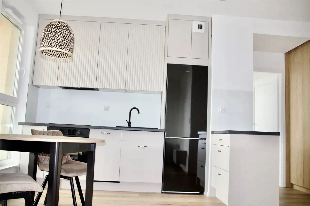 Kuchnia: zmywarka, płyta indukcyjna, piekarnik, pojemna chłodziarko-zamrażarka, rozkładana sofa, klimatyzacja