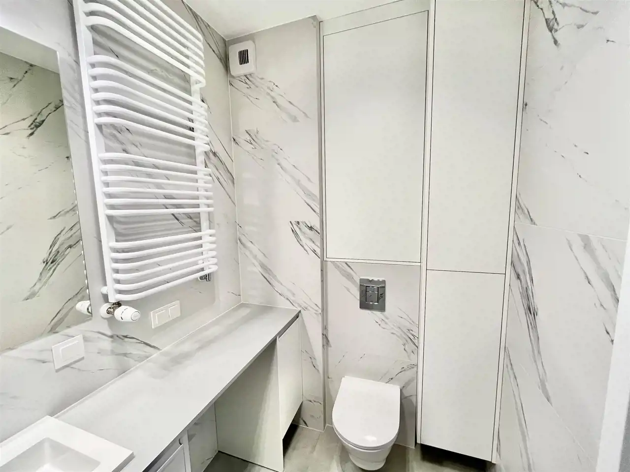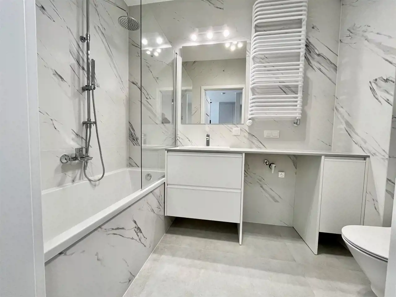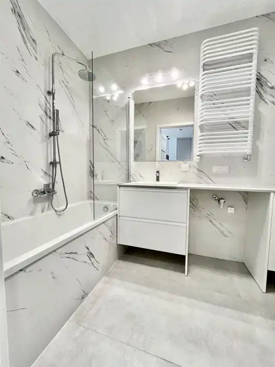 Łazienka wanna w zabudowie i sporo miejsca do przechowywania.