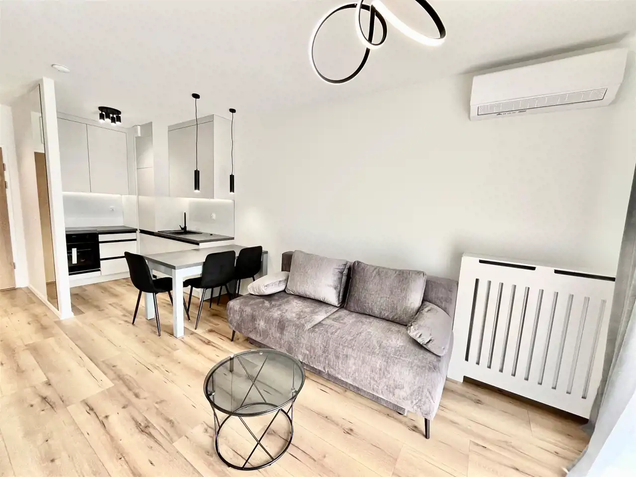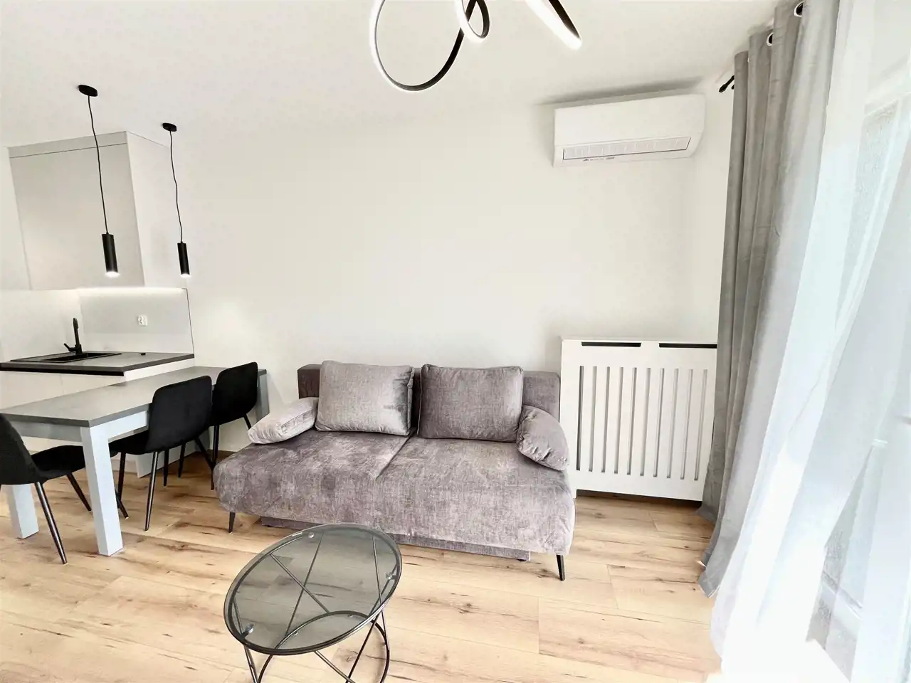 Kuchnia: zmywarka, płyta indukcyjna, piekarnik, pojemna chłodziarko-zamrażarka, rozkładana sofa, klimatyzacja