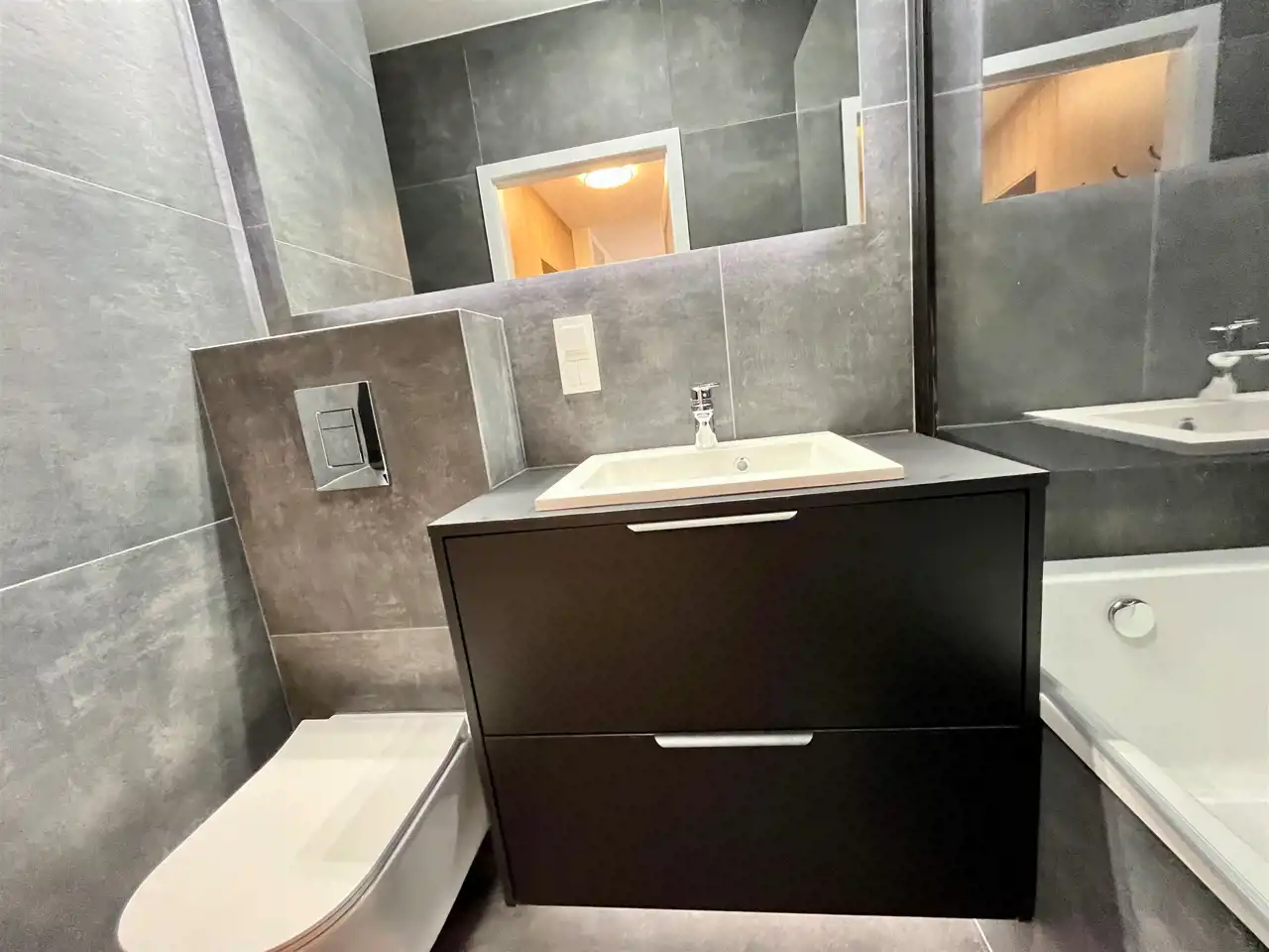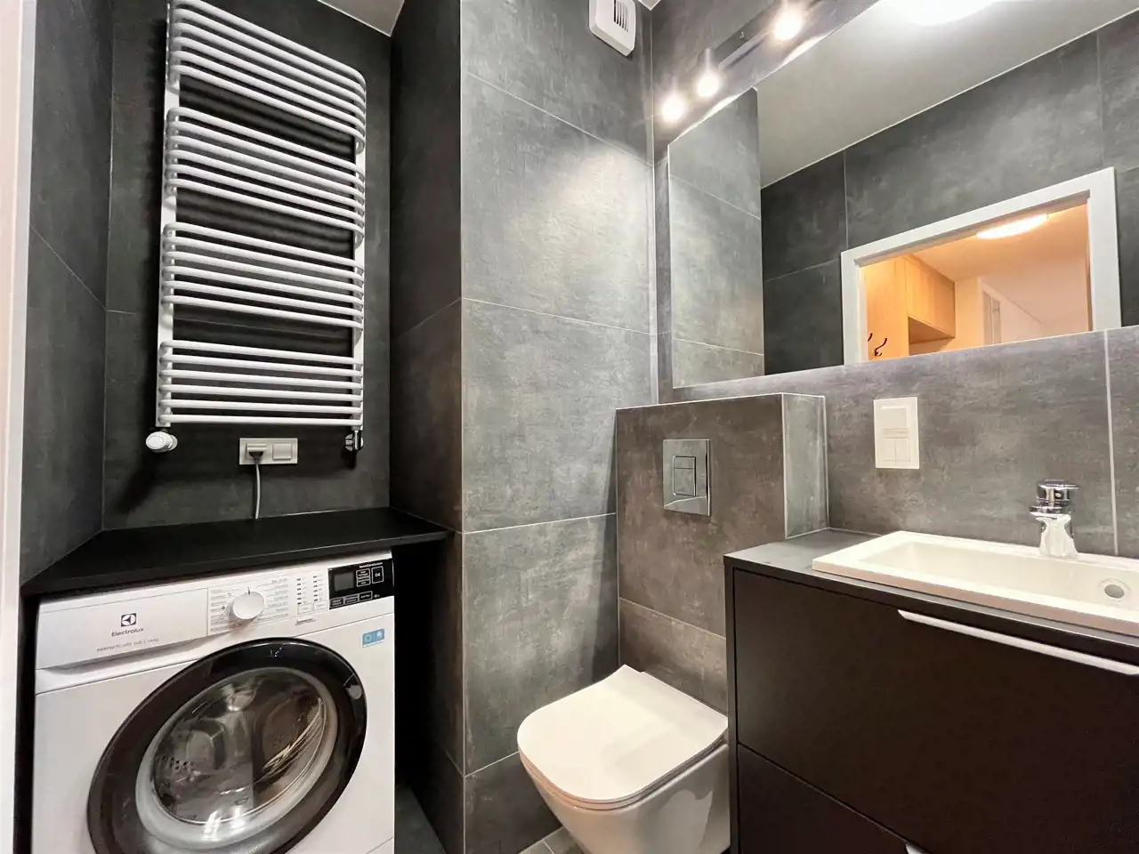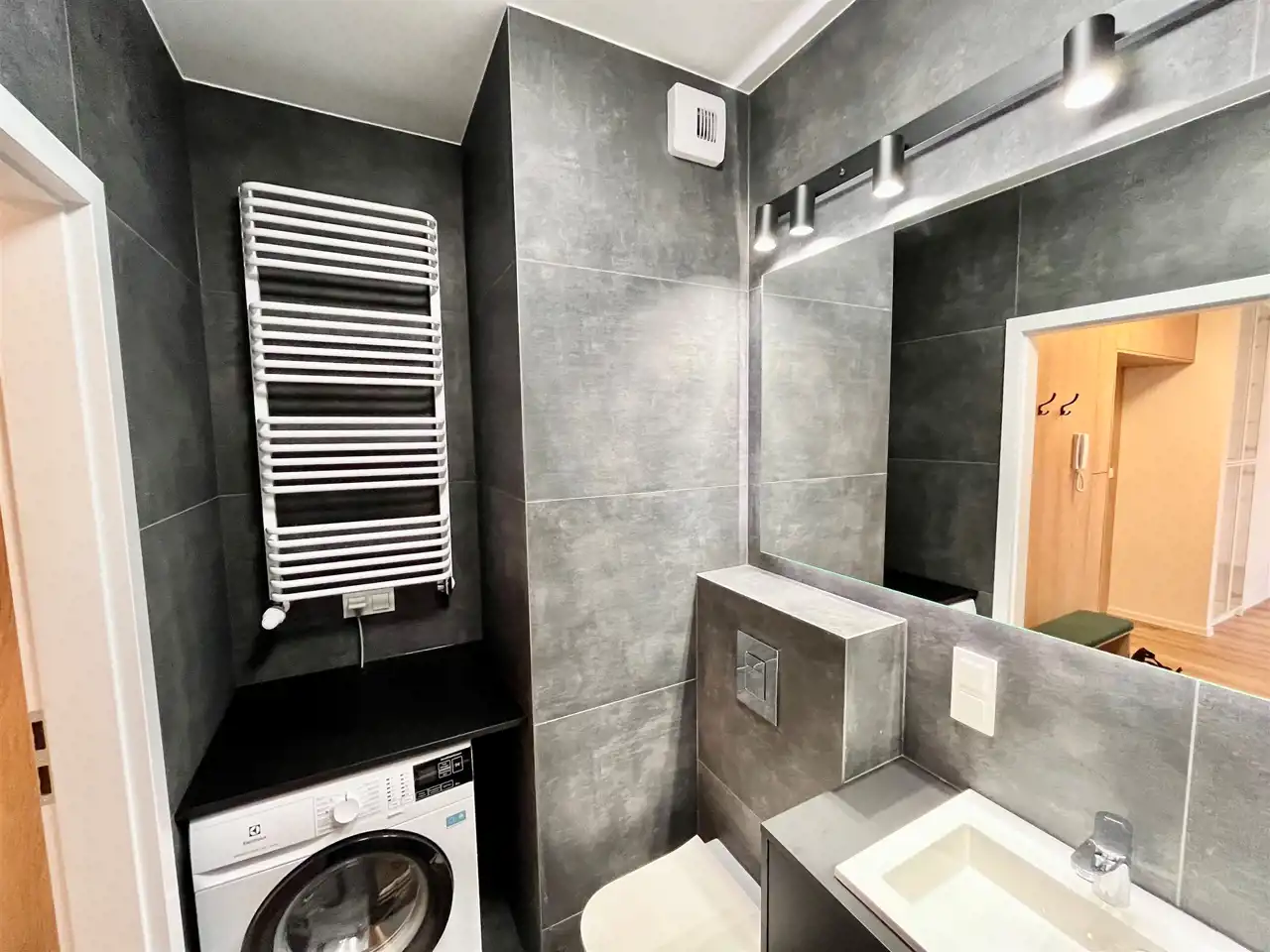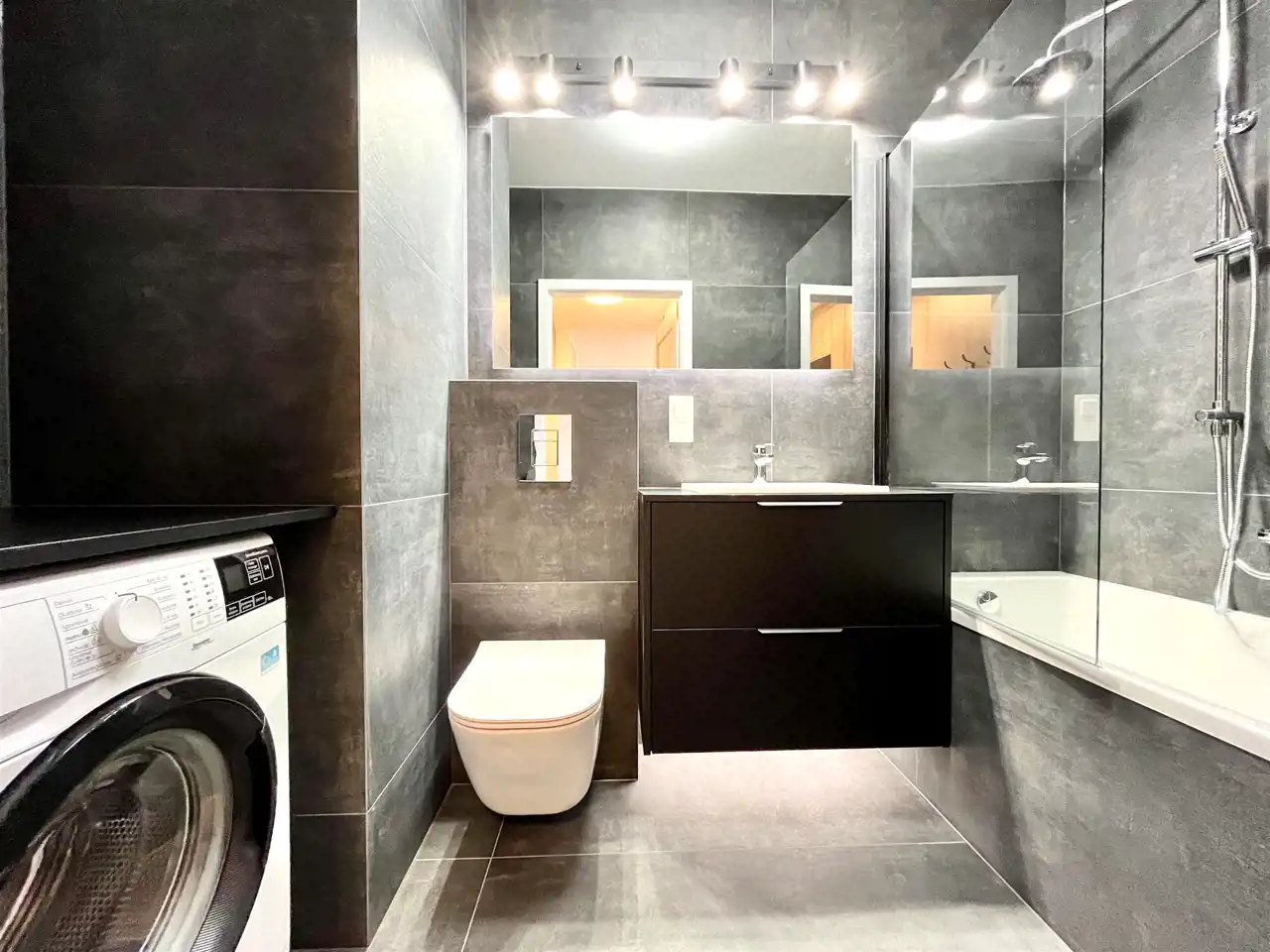 Łazienka: wanna, pralka, wc