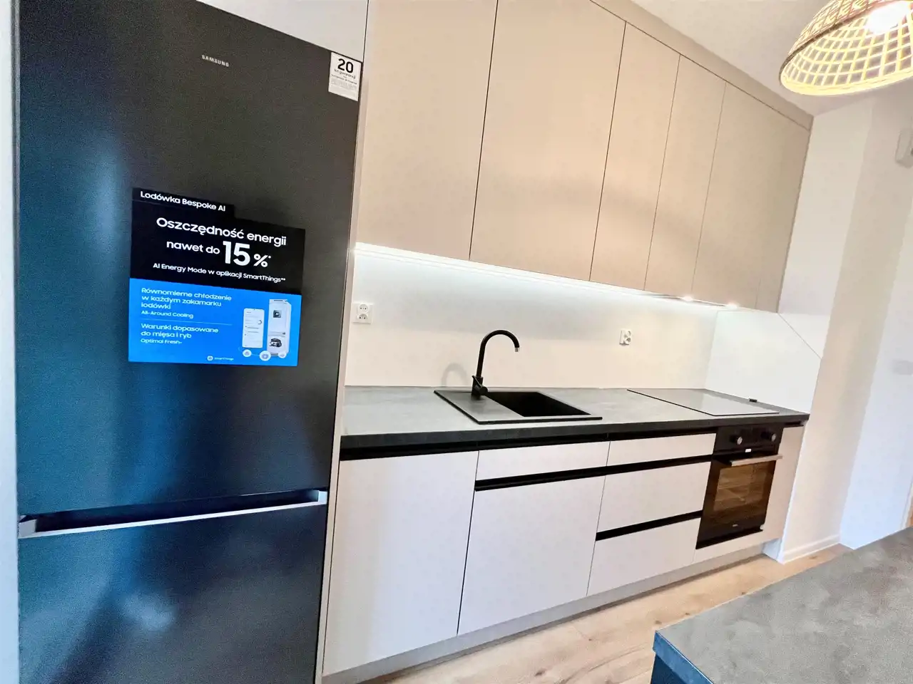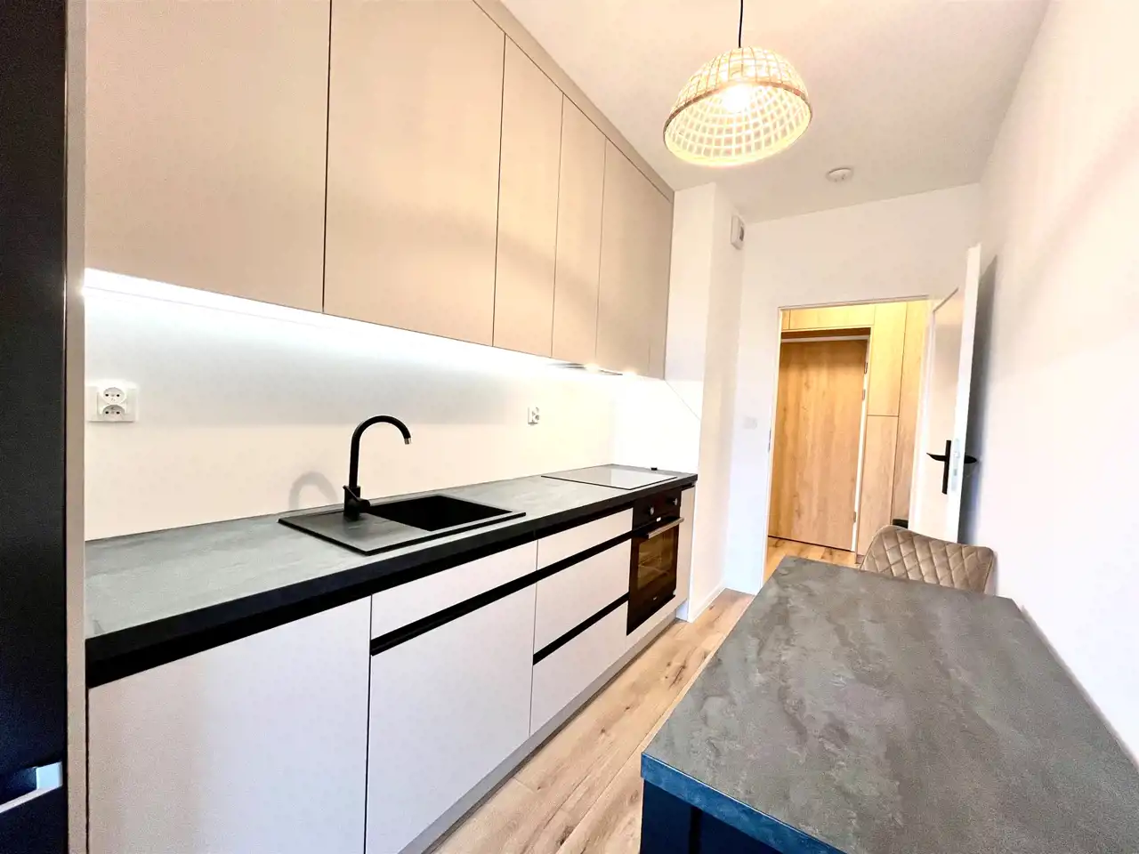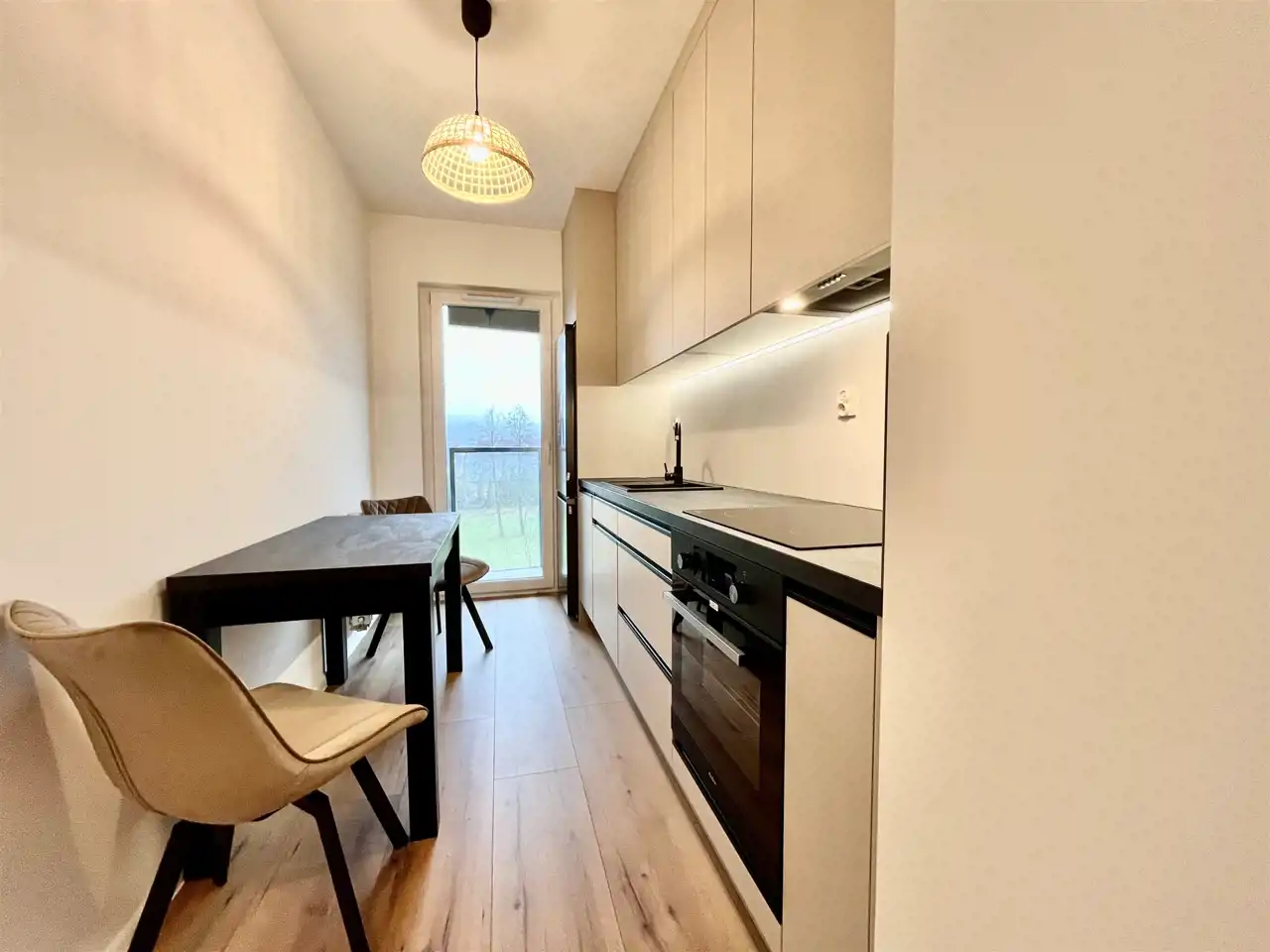 W kuchni nowoczesne meble na wymiar oraz sprzęt agd w zabudowie: chłodziarko-zamrażarka, zmywarka, płyta indukcyjna, zlew, piekarnik, okap, oświetlenie podszafkowe LED, stół i dwa krzesła.
