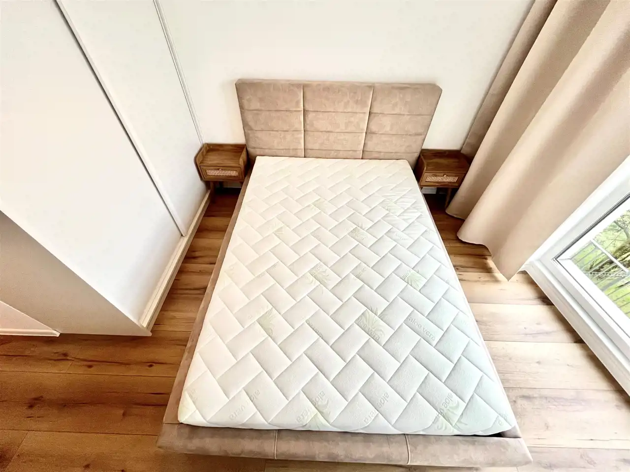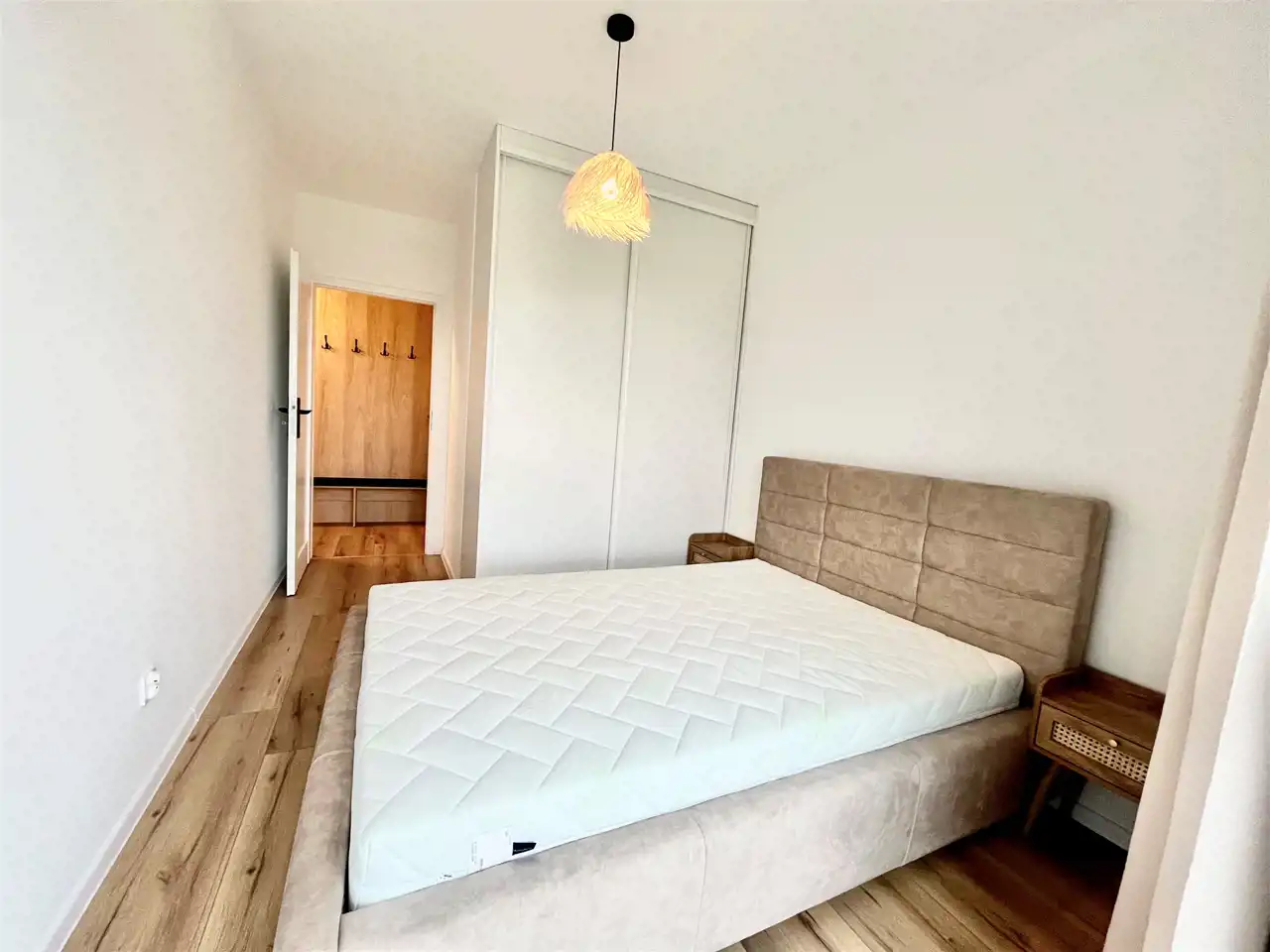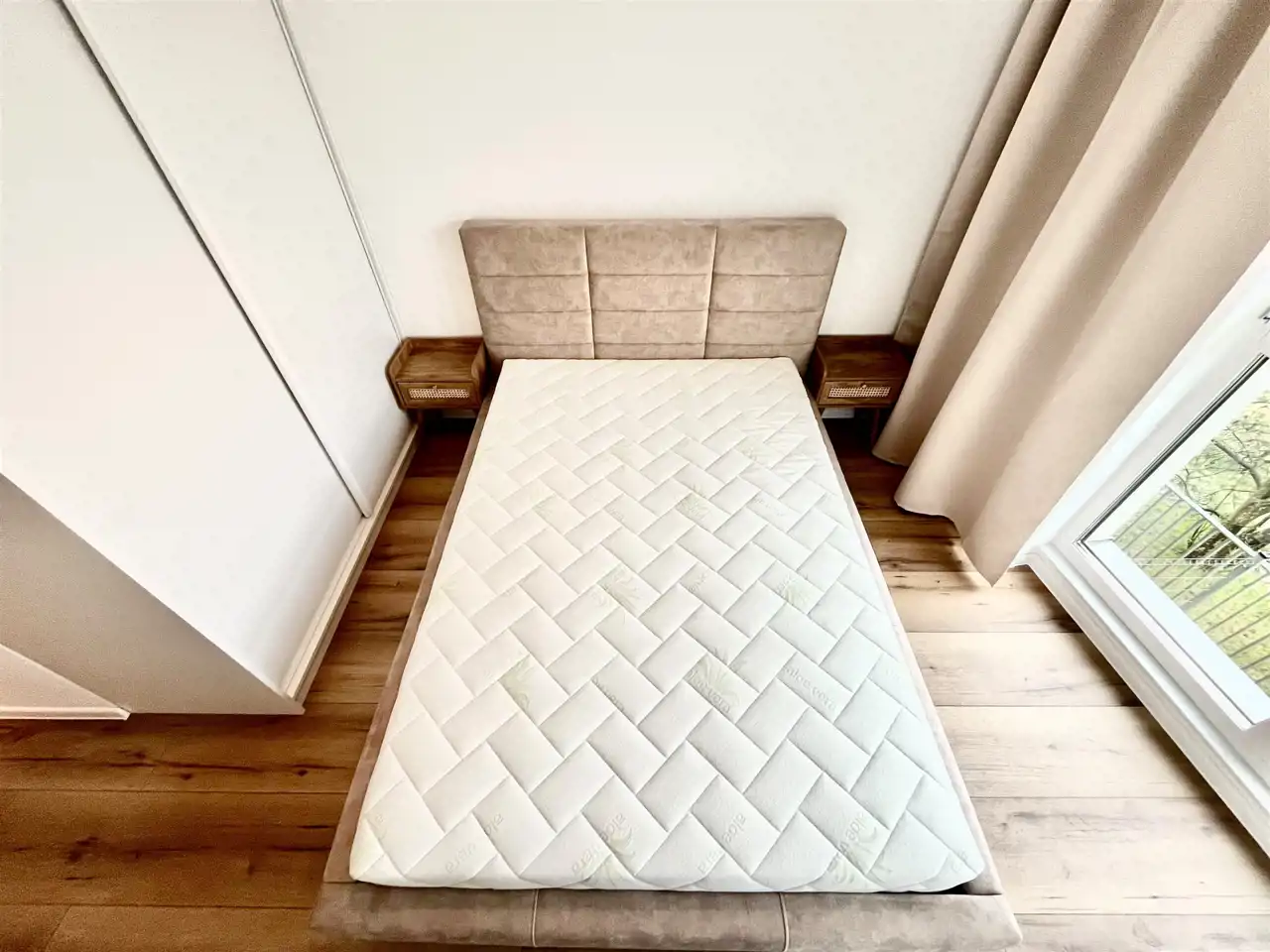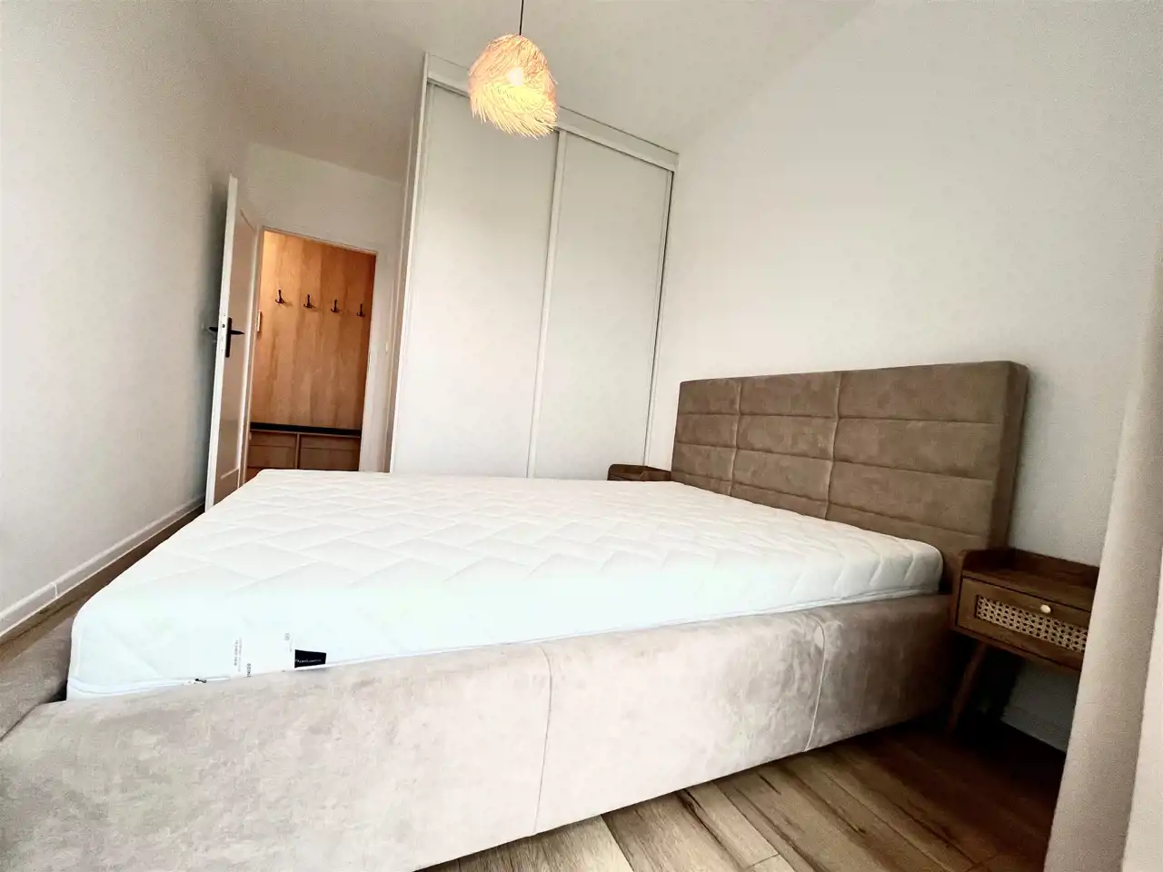 Sypialnia : łóżko podwójne z materacem, szafki nocne szafa w zabudowie , zasłony