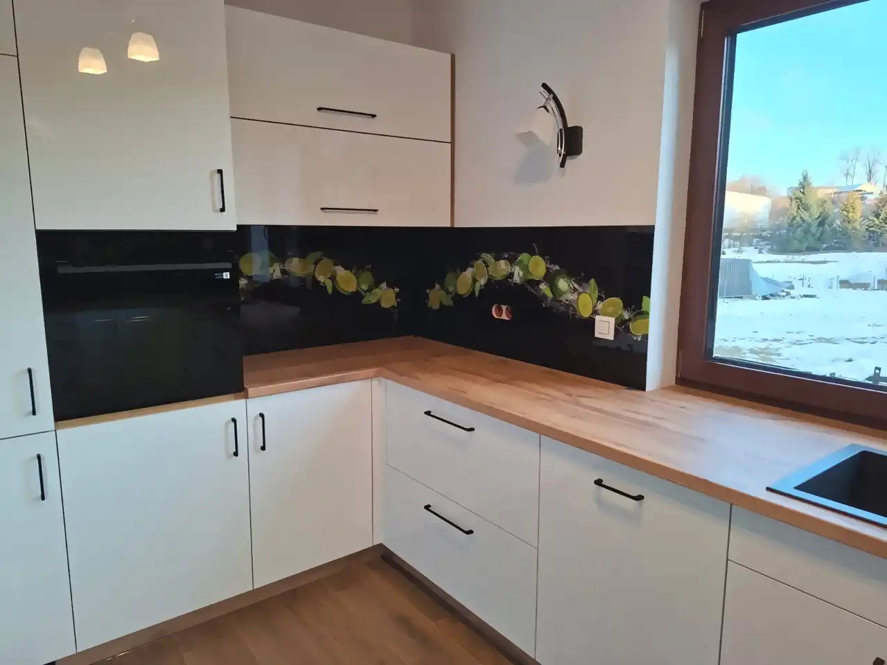 Kuchnia została wykonana na zamówienie i wyposażona w sprzęt AGD w zabudowie, co gwarantuje estetykę oraz wygodę codziennego użytkowania.