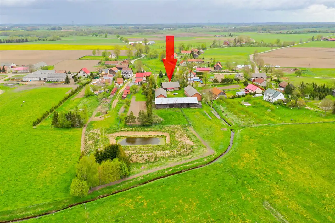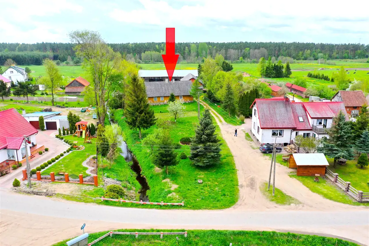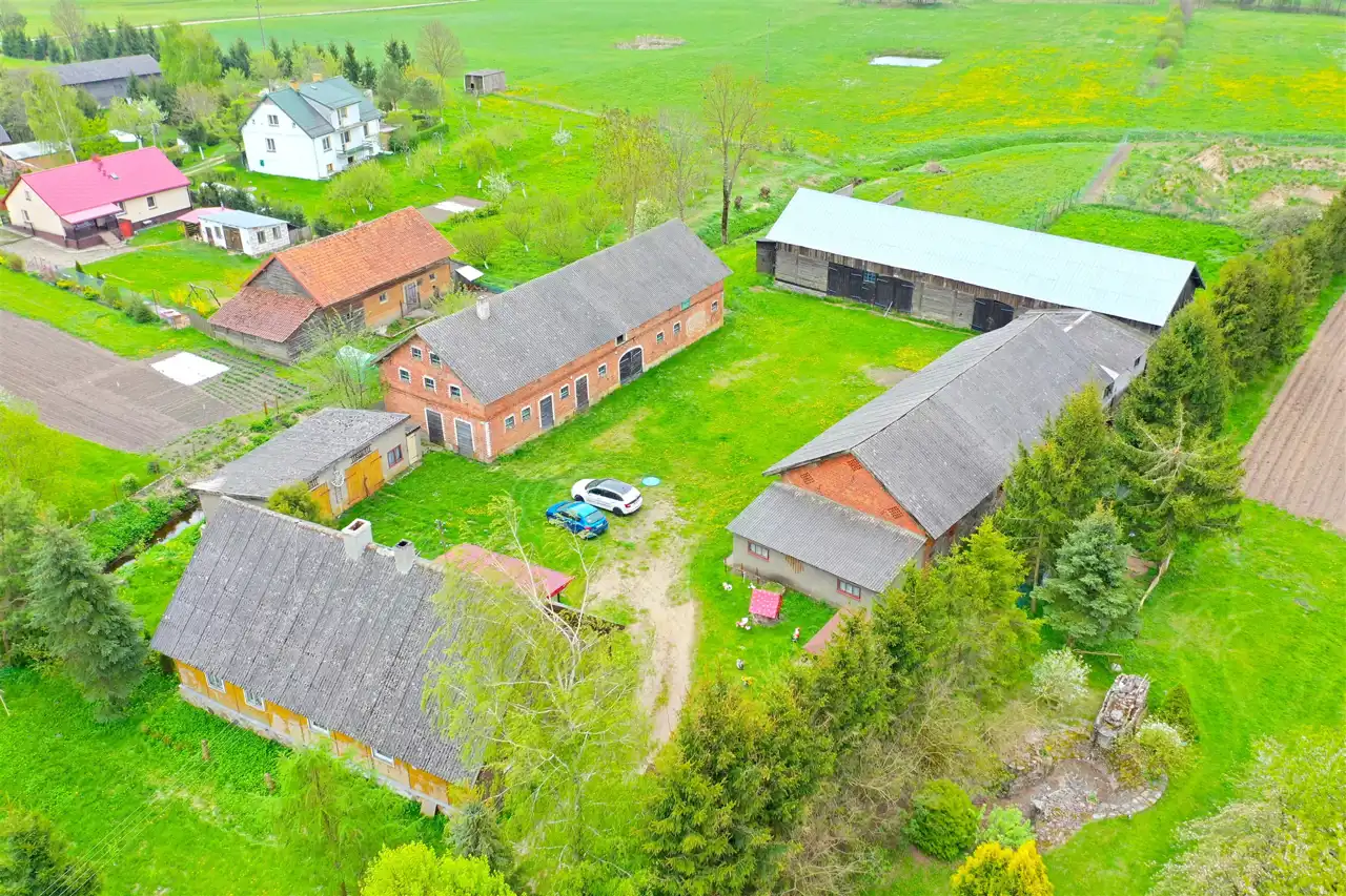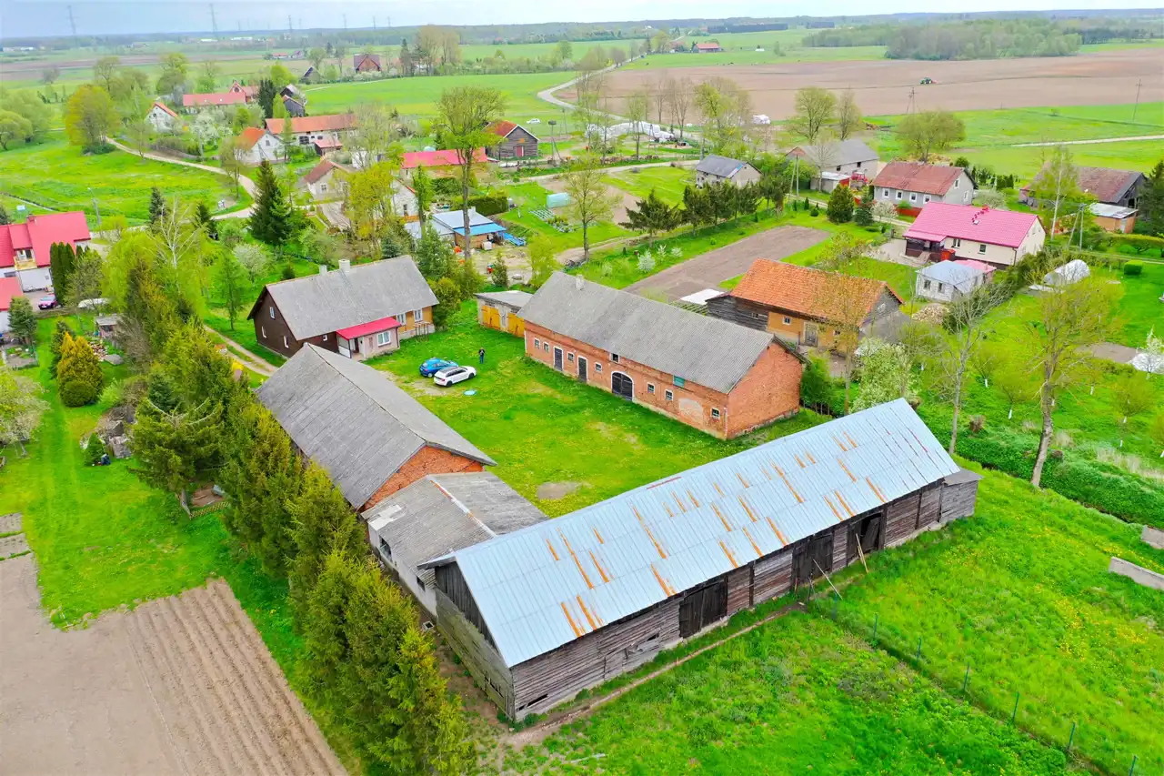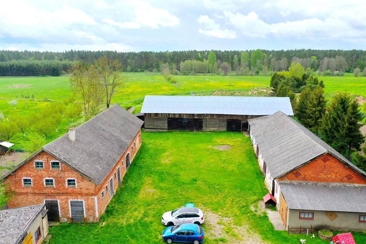 Nieruchomość składa się z 2 działek rolnych. Na jednej z nich posadowiony jest oryginalny mazurski dom jednorodzinny, o powierzchni użytkowej 125 m2, dwie obory z czerwonej cegły o powierzchniach zabudowy 247 m2 i 184 m2, drewniana stodoła o powierzchni zabudowy 263 m2 oraz dwa garaże o powierzchniach zabudowy 58 m2 i 34 m2.