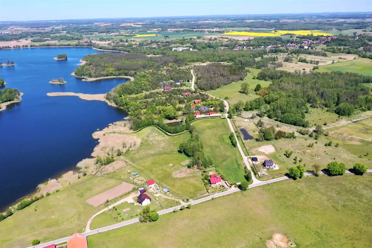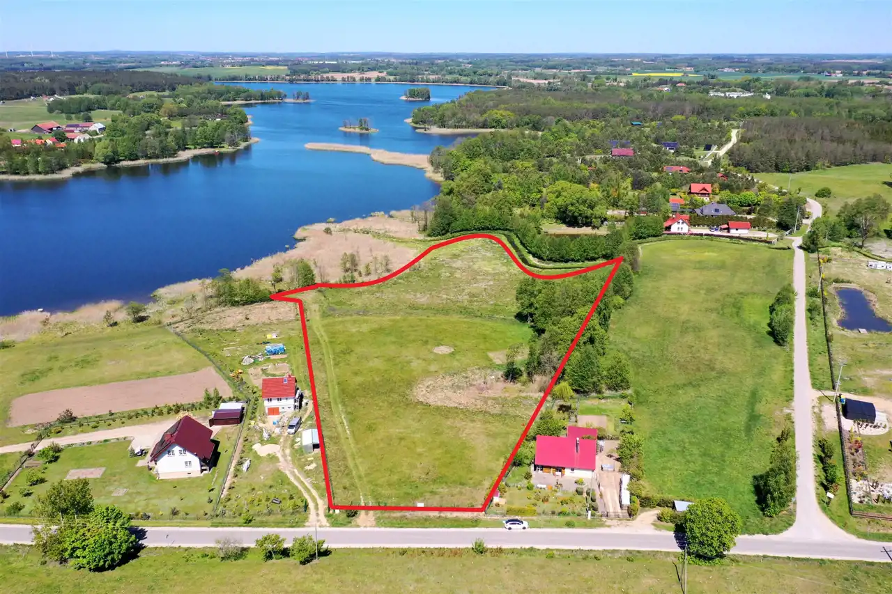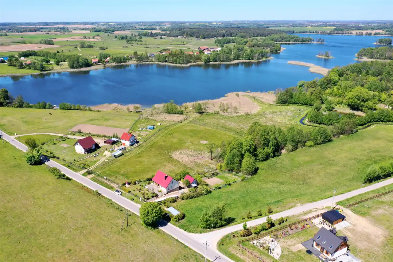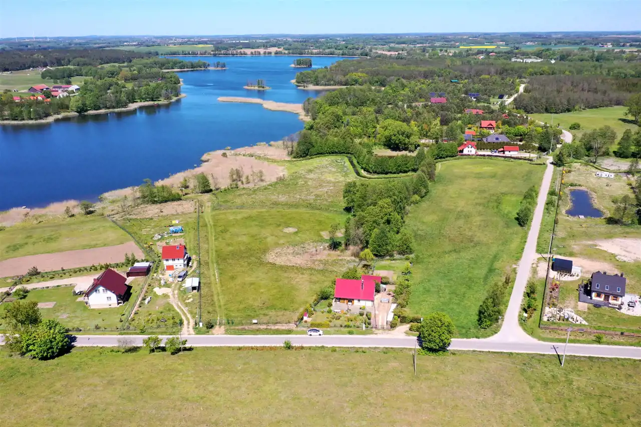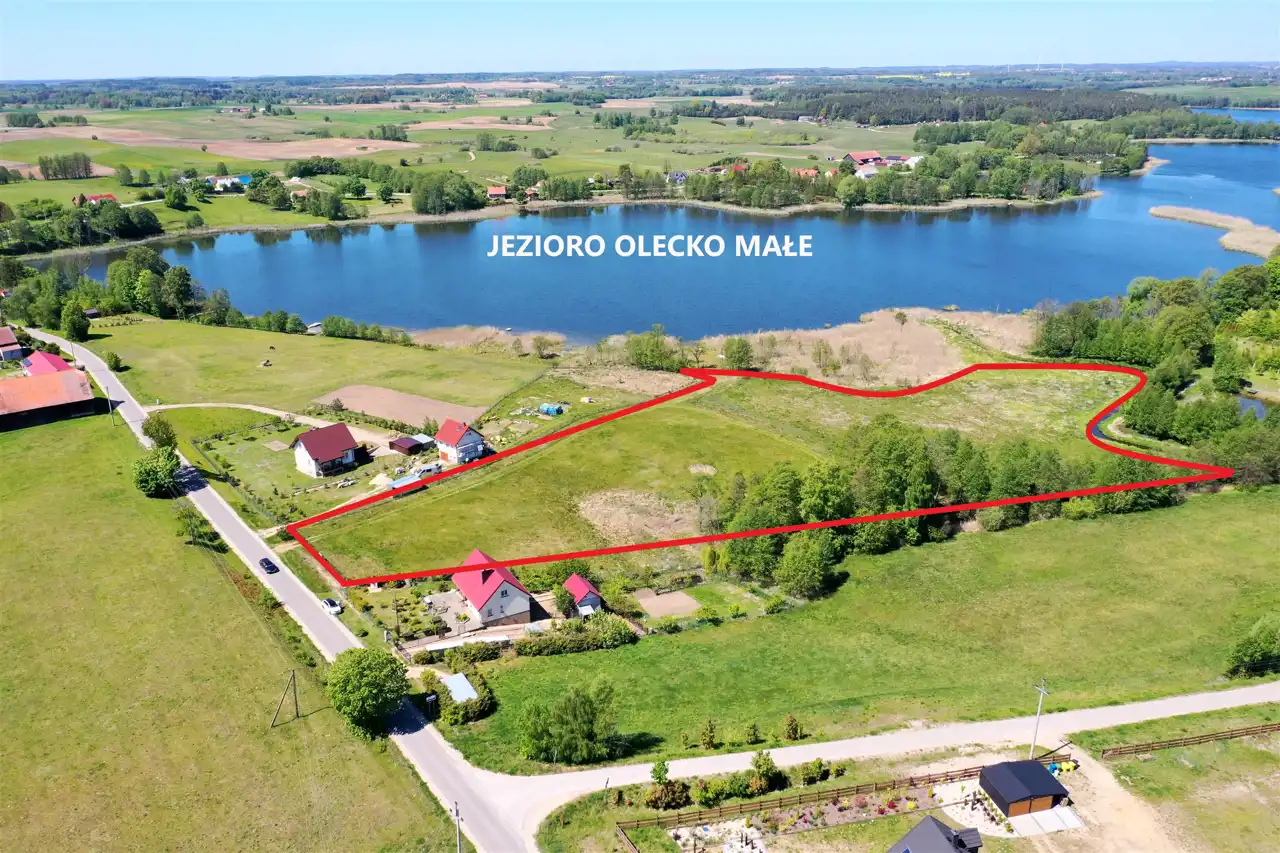 Działka zlokalizowana jest w cichej i spokojnej okolicy na obrzeżu wsi, graniczy bezpośrednio z lokalną asfaltową drogą gminną, zabudowanymi działkami i Jeziorem Olecko Małe. Teren działki jest lekko pagórkowaty i falisty, kształt działki nieregularny. Z miejsca przewidzianego pod zabudowę mieszkalną rozpościera się piękny widok na jezioro i okolice. Nieruchomość ta jest idealnym miejscem do budowy wymarzonego domu jednorodzinnego na Mazurach.
