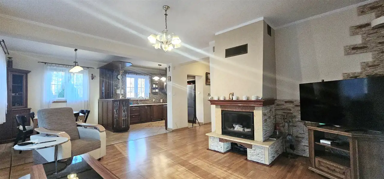 - kuchnia połączona z jadalnią i salonem (w salonie znajduje się kominek oraz wyjście na taras),