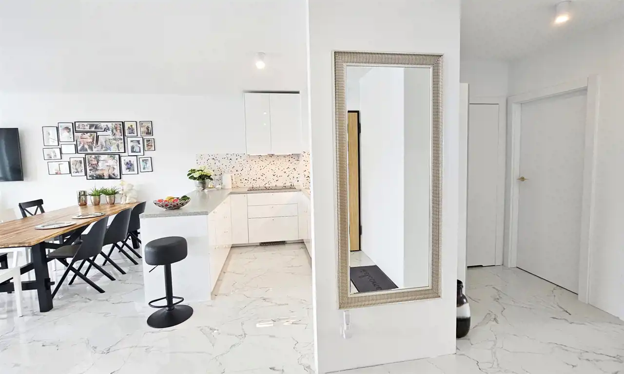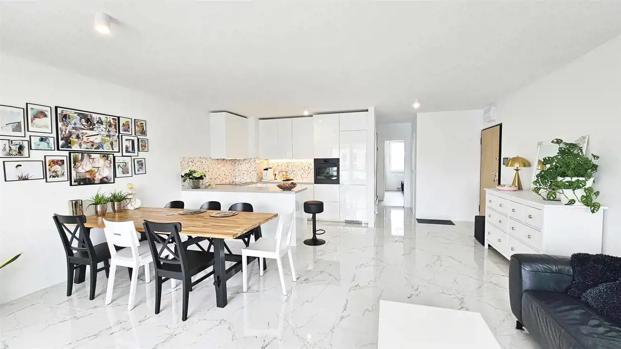 - Sercem mieszkania jest Salon: Jasny salon z aneksem kuchennym tworzy przestronną strefę dzienną do wspólnego spędzania czasu.