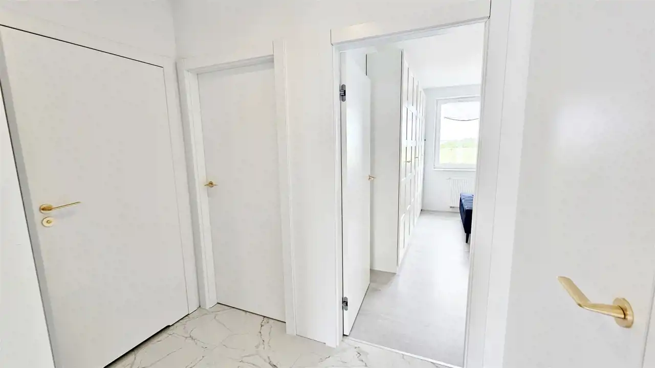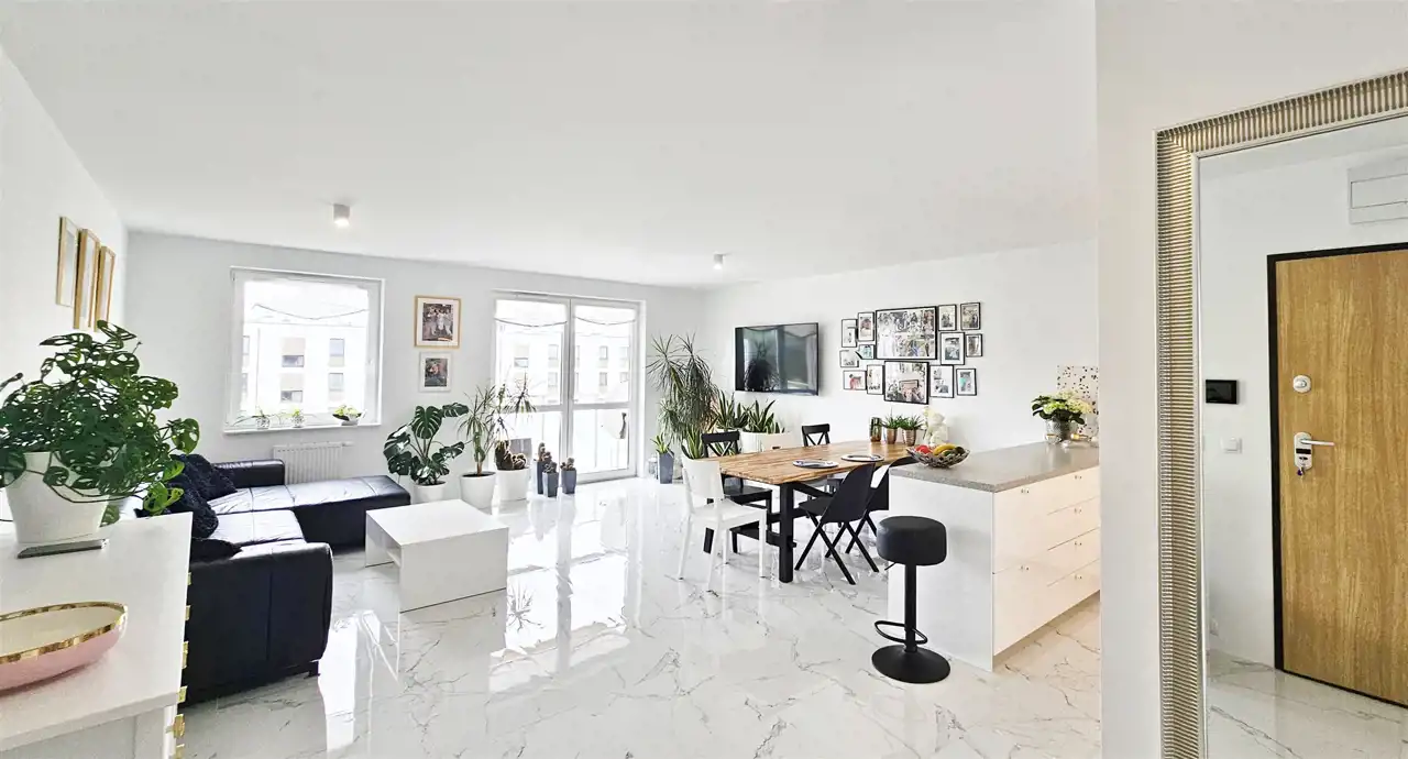 - Sercem mieszkania jest Salon: Jasny salon z aneksem kuchennym tworzy przestronną strefę dzienną do wspólnego spędzania czasu.