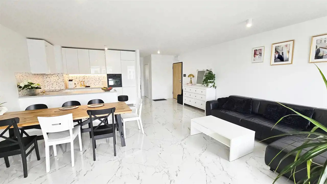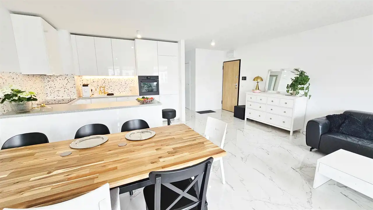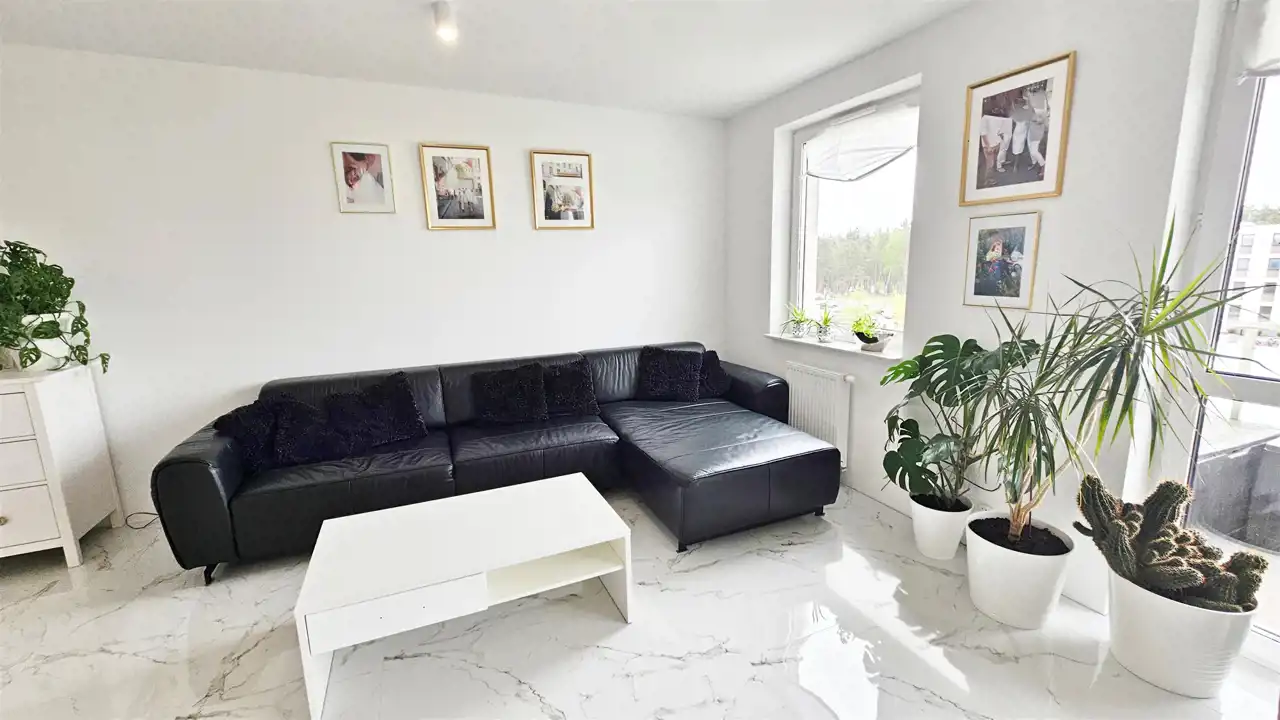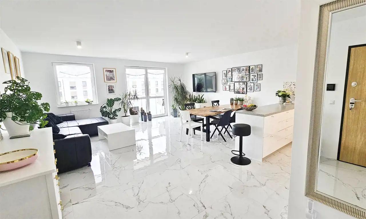 - Sercem mieszkania jest Salon: Jasny salon z aneksem kuchennym tworzy przestronną strefę dzienną do wspólnego spędzania czasu.