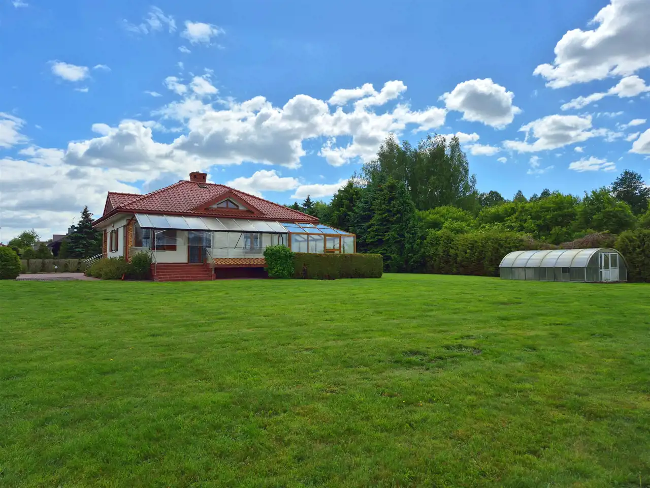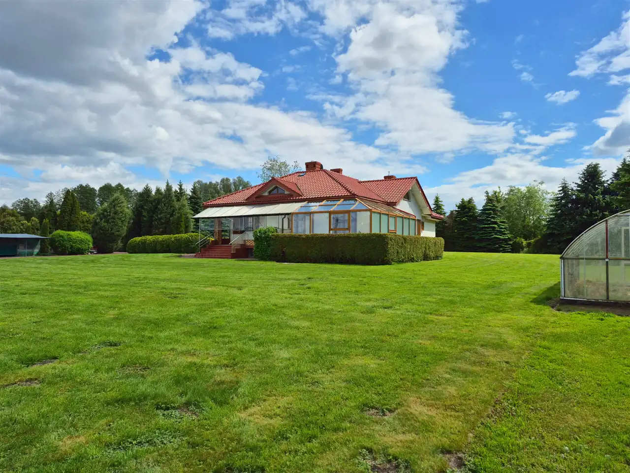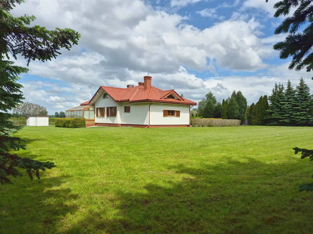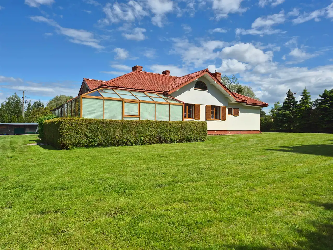 Całość ogrodzona i pięknie zagospodarowana. Monitoring i alarm. Automatyczna brama wjazdowa. Podjazd i teren wokół domu wyłożony kostką brukową, schody od frontu podgrzewane. W ogrodzie liczne, piękne nasadzenia. Na posesji znajduje się duży, zadbany staw, tuż przy nim domek, dalej zadaszona wiata z dodatkowym pomieszczeniem na narzędzia gospodarcze oraz mini szklarnia.