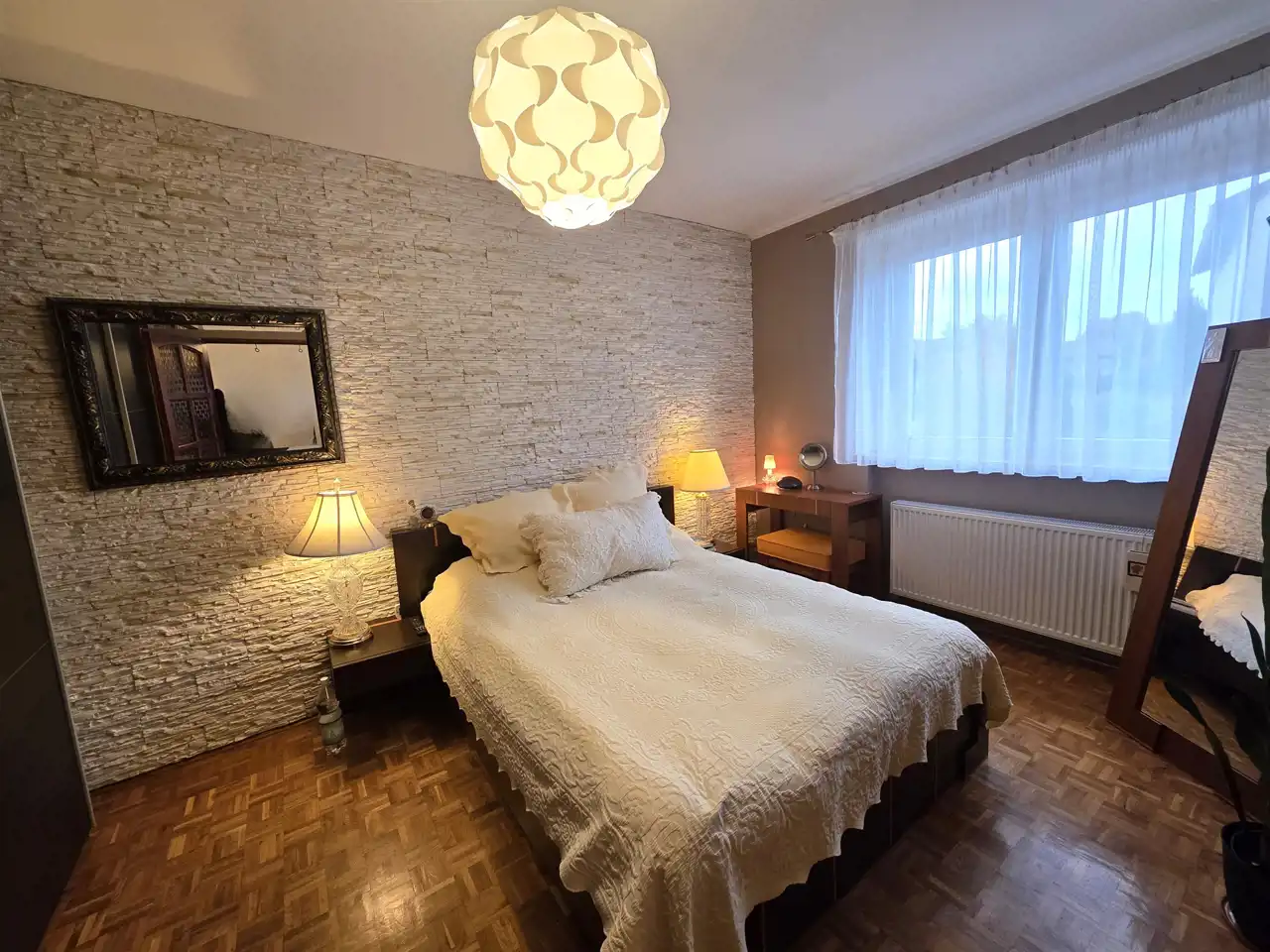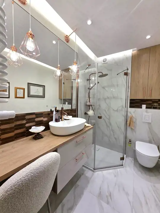- Parter: W tej części znajduje się przestronny salon, trzy sypialnie, kuchnia, przedpokój, wiatrołap, kotłownia oraz łazienka wyposażona w prysznic, WC z bidetem.