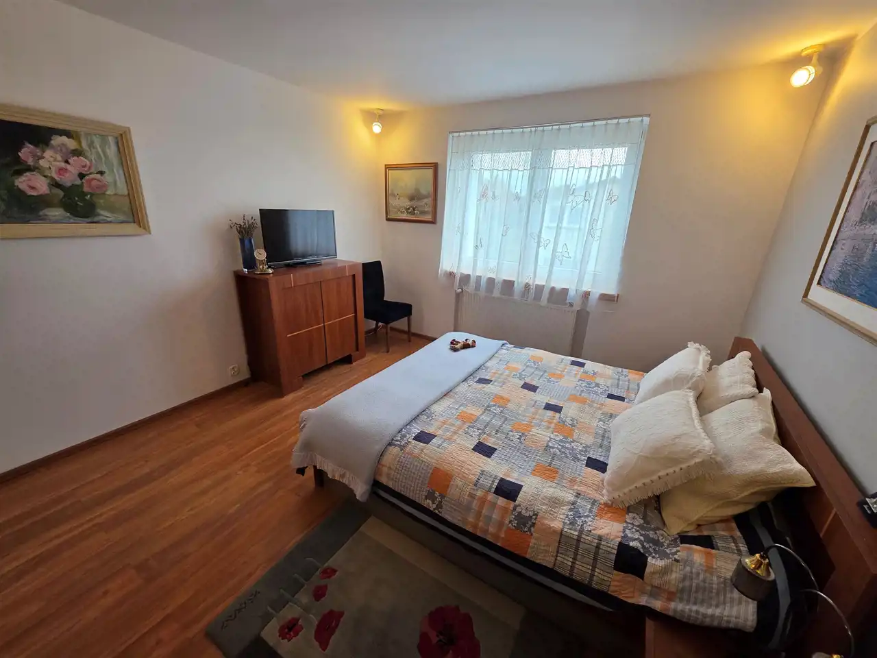 - Piętro: Na piętrze umiejscowiono trzy dodatkowe pokoje oraz łazienka z wanną.