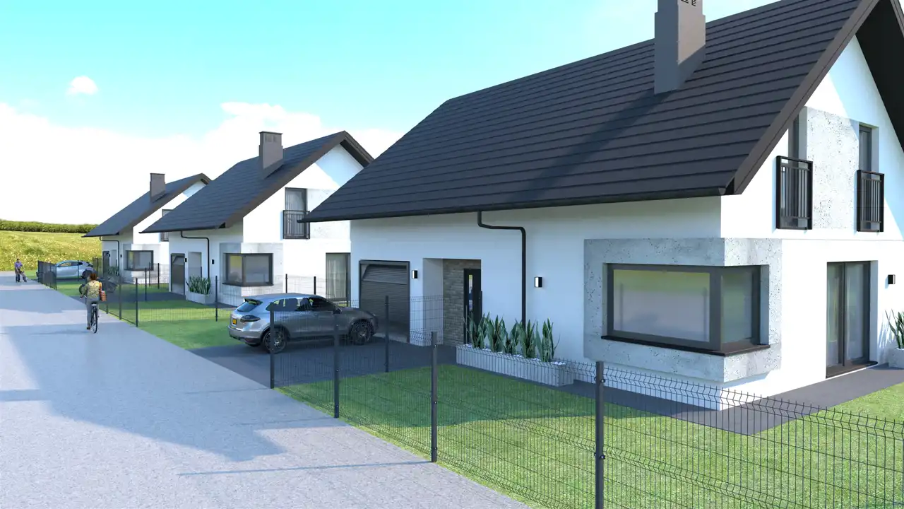 - ogrodzenie panelowe w kolorze antracyt, brama wjazdowa wspólna na całe osiedle wraz z wideodomofonem i furtką, licznik administracyjny dla obsługi bramy.