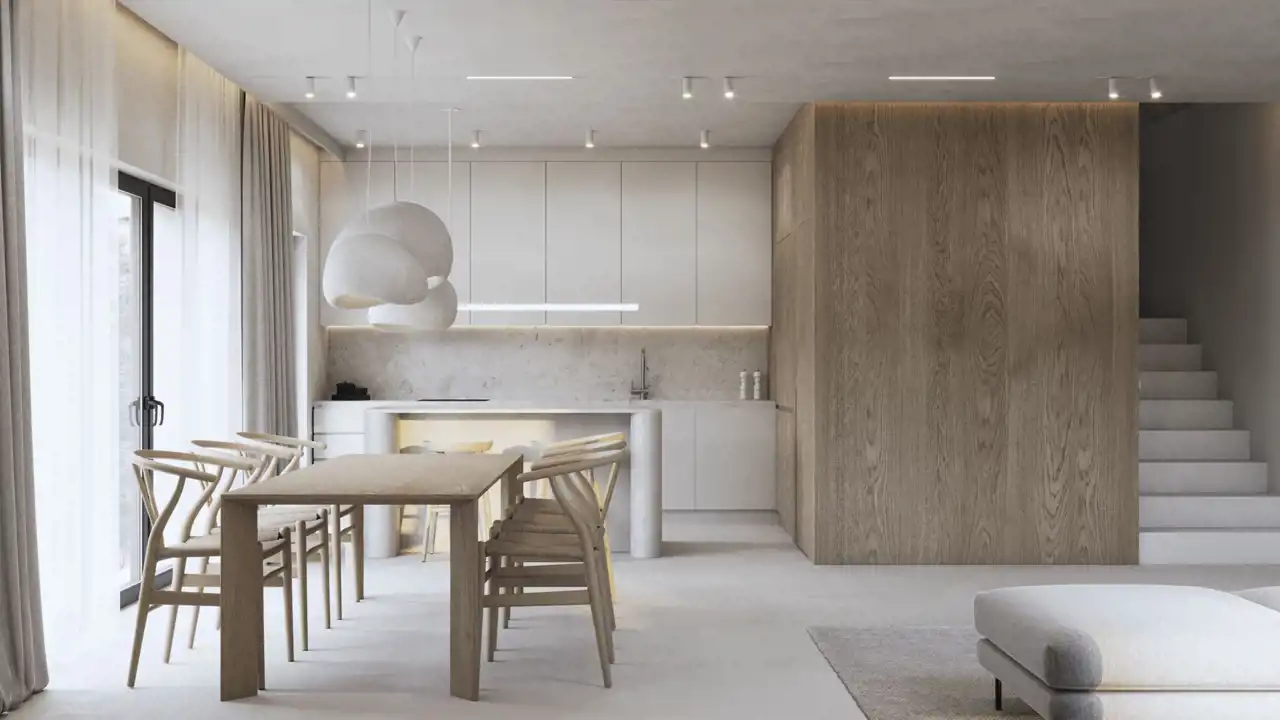 przestronny salon z jadalnią i dużymi przeszkleniami otwierającymi się na ogród,