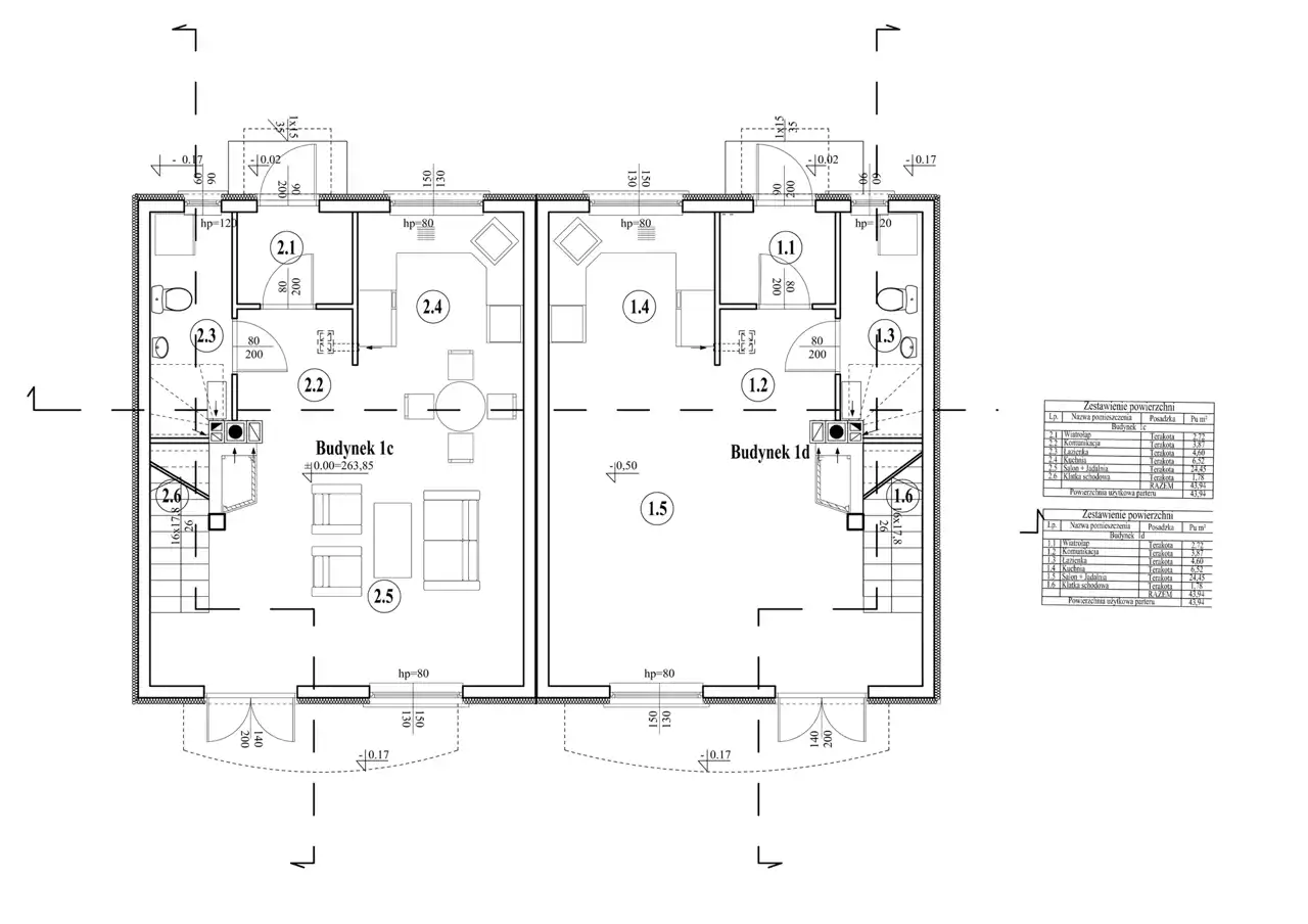 Parter: salon (24,02m2), kuchnia (6,27m2), komunikacja (3,94m2), łazienka (4,48m2), klatka schodowa (1,97m2), wiatrołap (2,54m2) - łącznie 43,22 m2