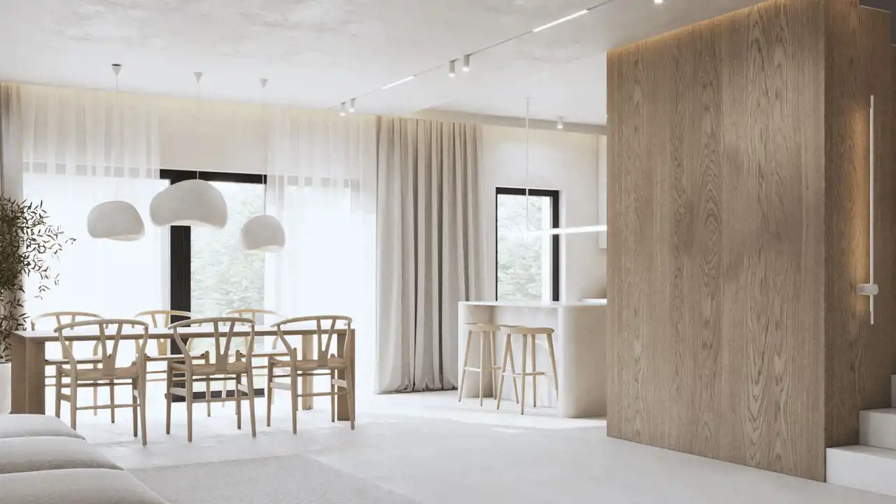 przestronny salon z jadalnią i dużymi przeszkleniami otwierającymi się na ogród,