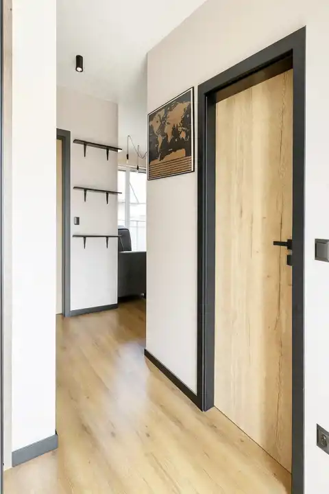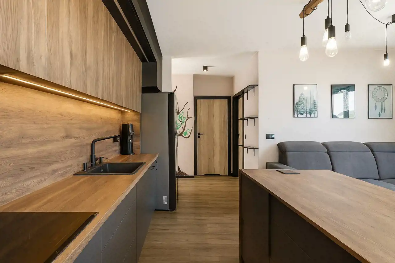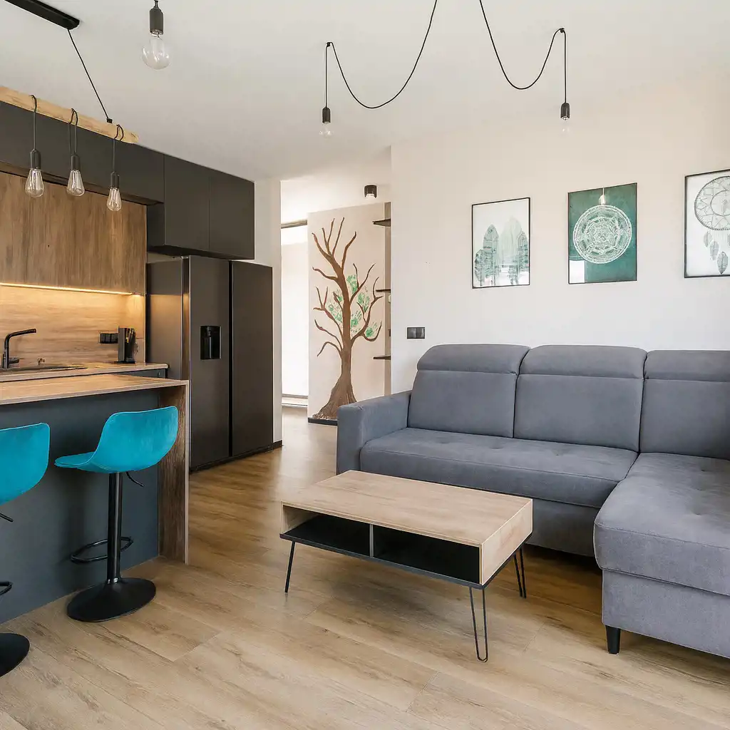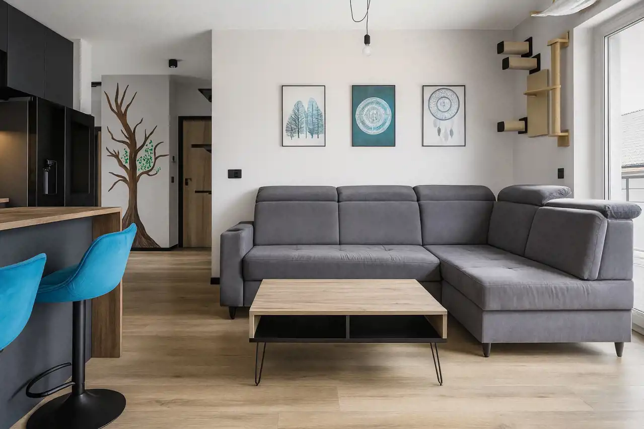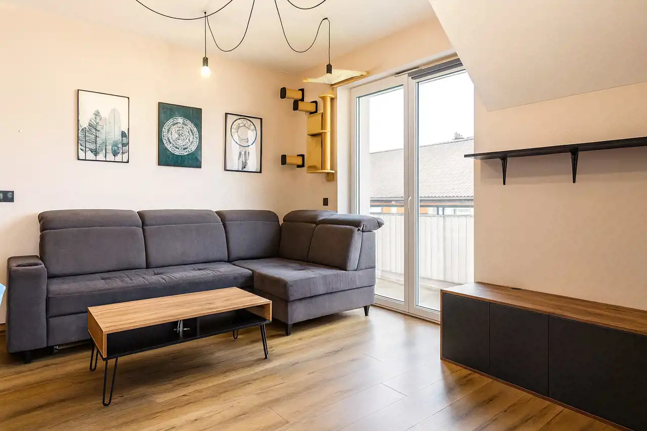 - przestronnego salonu połączonego z aneksem kuchennym oraz wyjściem na balkon,