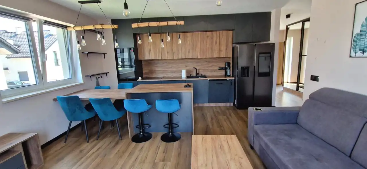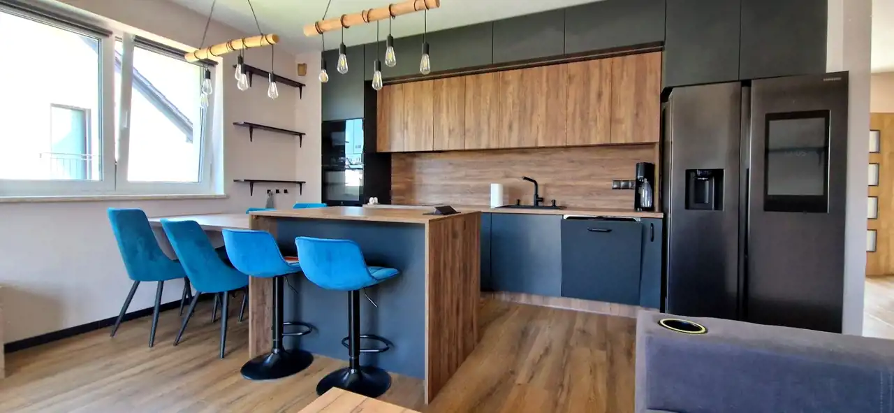 - kuchnia wyposażona w dużą nowoczesną lodówkę z kostkarką Samsung, płytę indukcyjną Elektrolux, zmywarkę Elektrolux, piekarnik Ellektrolux, mikrofala i okap firmy Amica.